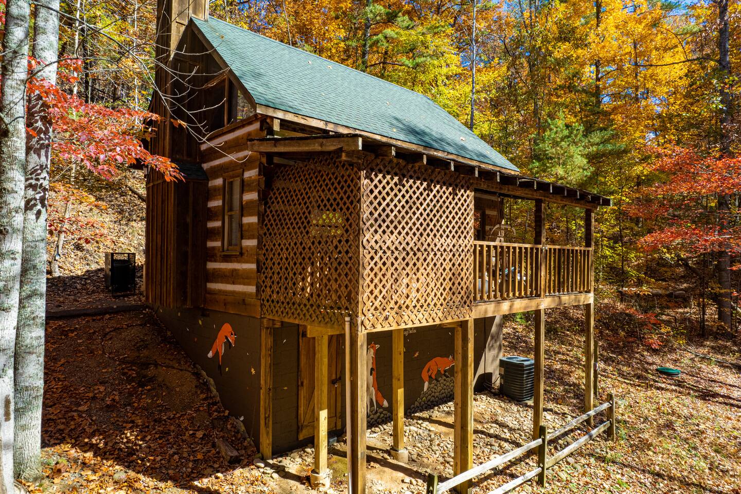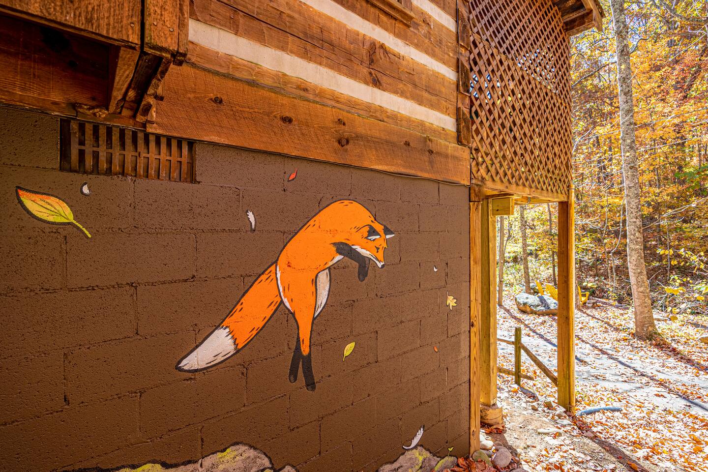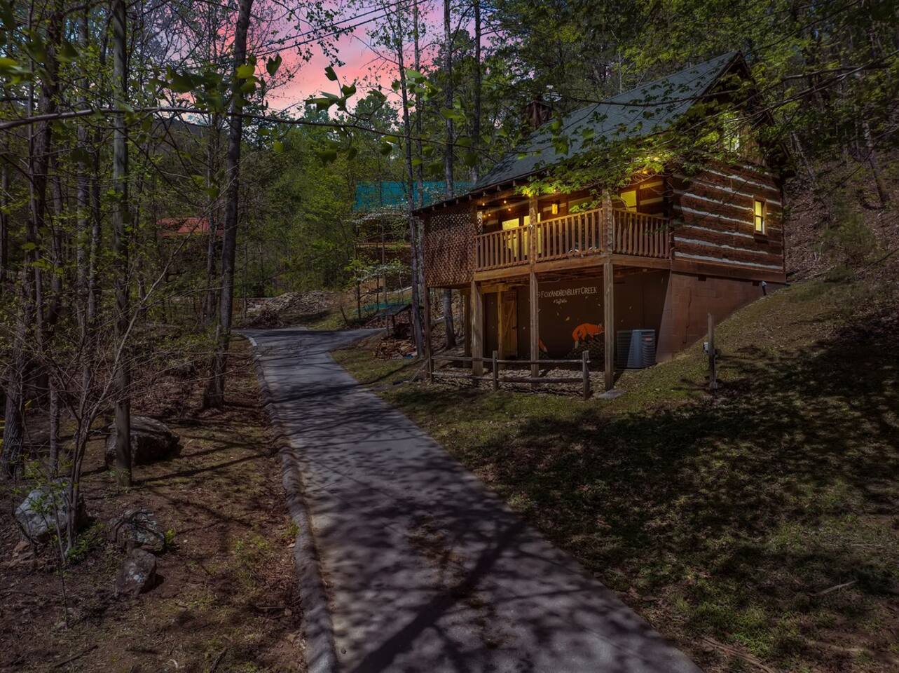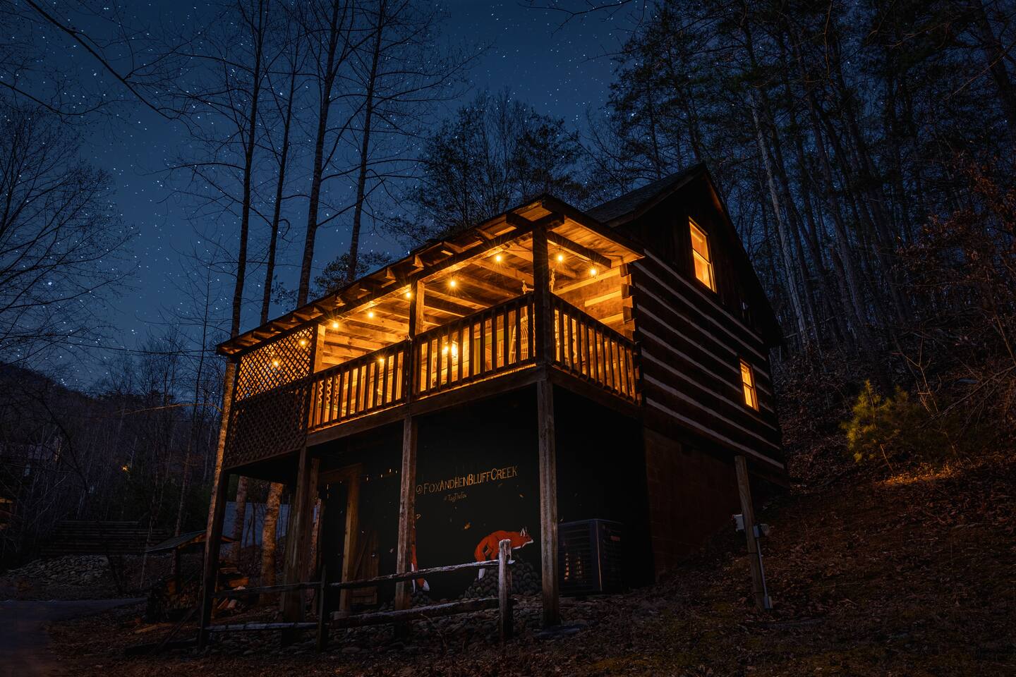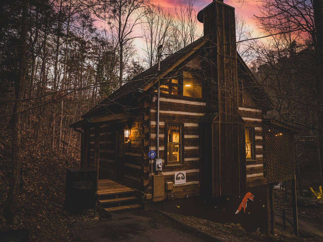 Located centrally in Bluff Mountain Acres only minutes from the action in Pigeon Forge and easy access to the Great Smoky Mountain National park side entrance. If you’re traveling with another family - book our next door sister cabin, Hen at Bluff Creek, so you will each have your own space - while only being steps away on our private paved road. THE PROPERTY: 800 Sq Ft True Log Cabin | 2 Levels Open Loft | Full Size Washer/Dryer | ¾ acre private land | Private Hot Tub, Charcoal Grill & Outdoor Fire Pit with Adirondack chairs | Whole Property 800 MB Wifi OUTDOORS: Relax in your outdoor lounge to enjoy the serenity of nature from your deck with beautiful tall timbers across the property that provide a treehouse-like feel. A luxurious Serena & Lily double swinging chair on the front deck gazes into the trees of your private retreat. Soothe sore muscles from a hike in your large hot tub while peeking at wildlife. Unwind by the fire pit with seating for 4 while listening to the gentle sounds of the seasonal creek steps from the cabin. Capture your latest IG pose for selfies in front of our local artist Fox murals around the foundation of our cabin. INDOORS: Inside Fox’s two level cabin you’ll find comforts to immediately put you in a chill mountain vibe. Warm earth tones adorn the cozy living room where you can kick back by our converted electric fireplace or catch up on the latest movie on the massive 65” 4K Smart TV (complete with Sonos soundbar and access to all the needed streaming apps like Netflix, Amazon Prime, HBO, Hulu and custom curated content on Plex). An eat-in kitchen (seating for 4) with a retro feel allows you to cook up your favorite meal in style with all of the necessary appliances and gadgets - including an Air Fryer. Inside the downstairs nook, an oversized pantry houses a large washer and dryer should you need to take care of any laundry needs during your stay (eco-friendly detergent sheets provided). A full size bathroom with shower/bath combination is available directly off of the nook. Full HVAC system with forced air heat and air-conditioning combined with a massive 70” fan in the great room allows you to enjoy any season in comfort. Travel up the stairs to the airy open loft bedroom with a gel-foam queen bed where you will wake up looking at the tree tops. Upstairs also houses a private half-bathroom-and closet for your belongings. If you have to catch up on work, we have a comfortable work from home setup complete with desk, chair and task lighting. High speed internet with multiple mesh access points provides blazing fast speed and coverage (800 MB down) both inside and outside the home. Large USB and AC charging stations are thoughtfully placed on both nightstands so you and your travel companion are always ready for the adventures ahead. Sleeps 2 extremely comfortably and easily accommodates 4 with the pull out couch in the lower living room. FOX CABIN HIGHLIGHTS: ✔ 1 Bedroom (Queen cool-gel foam mattress) with luxury bamboo blend linens ✔ 1.5 Bathrooms ✔ 1 Pullout sofa (for an additional 2 guests - great for the kids) ✔ 4 Person Hot Tub on the deck ✔ 2 Person relaxing rope chair swing on the deck ✔ 65” 4K Smart TV with Streaming apps + Sonos Soundbar ✔ Reliable and blazingly fast, 800MB Mesh high-speed WiFi across the entire property ✔ Desk with comfortable chair and task lamp ✔ Full size Washer/Dryer (with provided eco-friendly detergent sheets) ✔ Fully purified mountain water filtration system (no need for plastic water bottles) We require a signed rental agreement to fully confirm your booking that will include a copy of your state issued ID. We welcome adults that are 21 years or older.