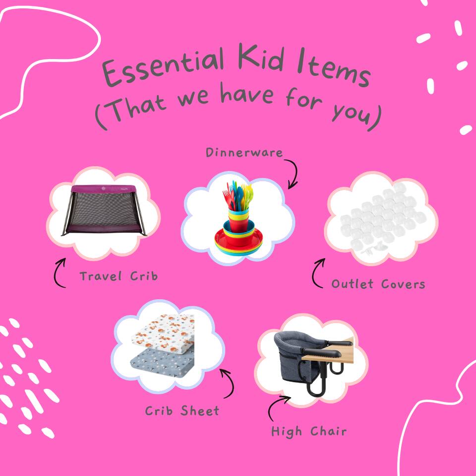 - Essentials Towels, bed sheets, soap, toilet paper, and pillows