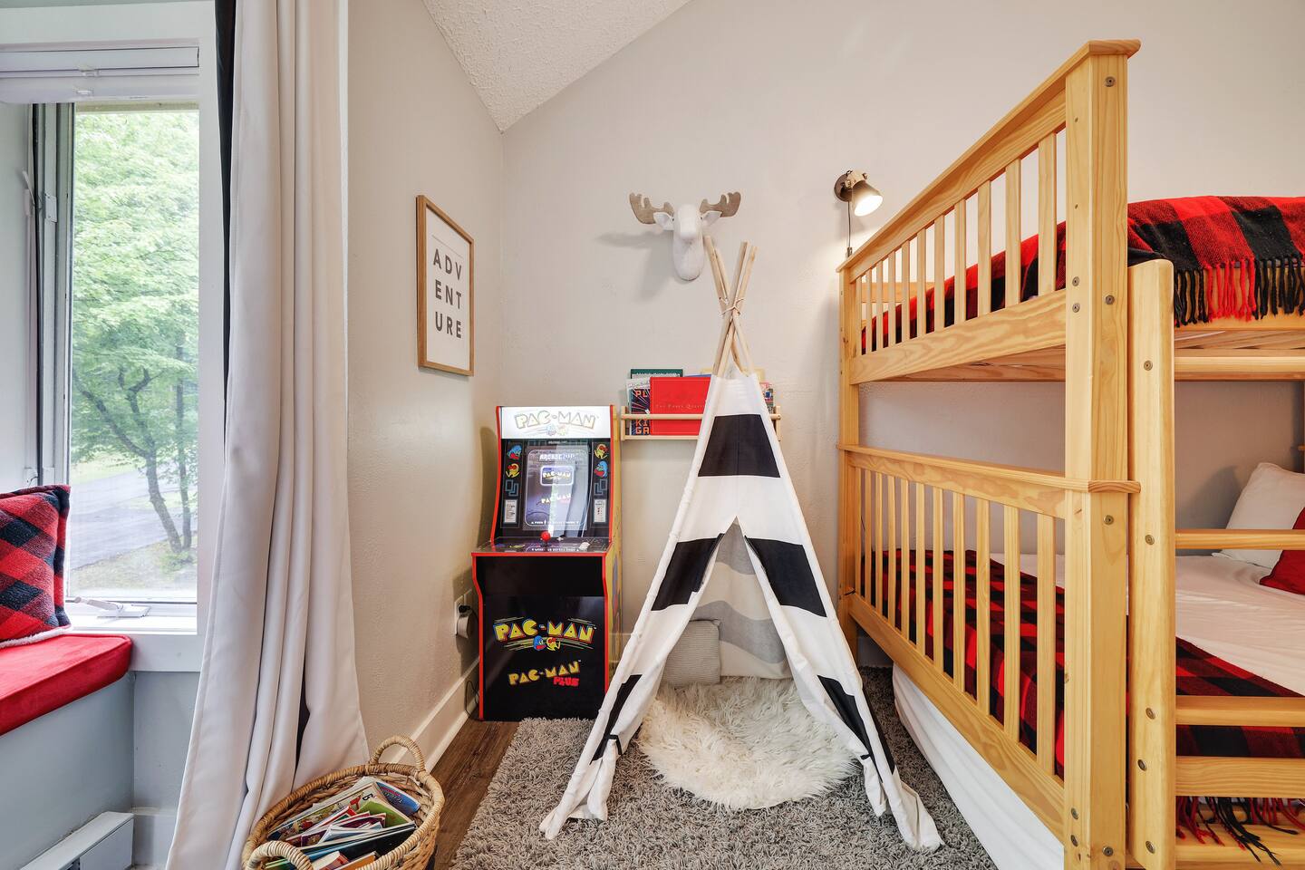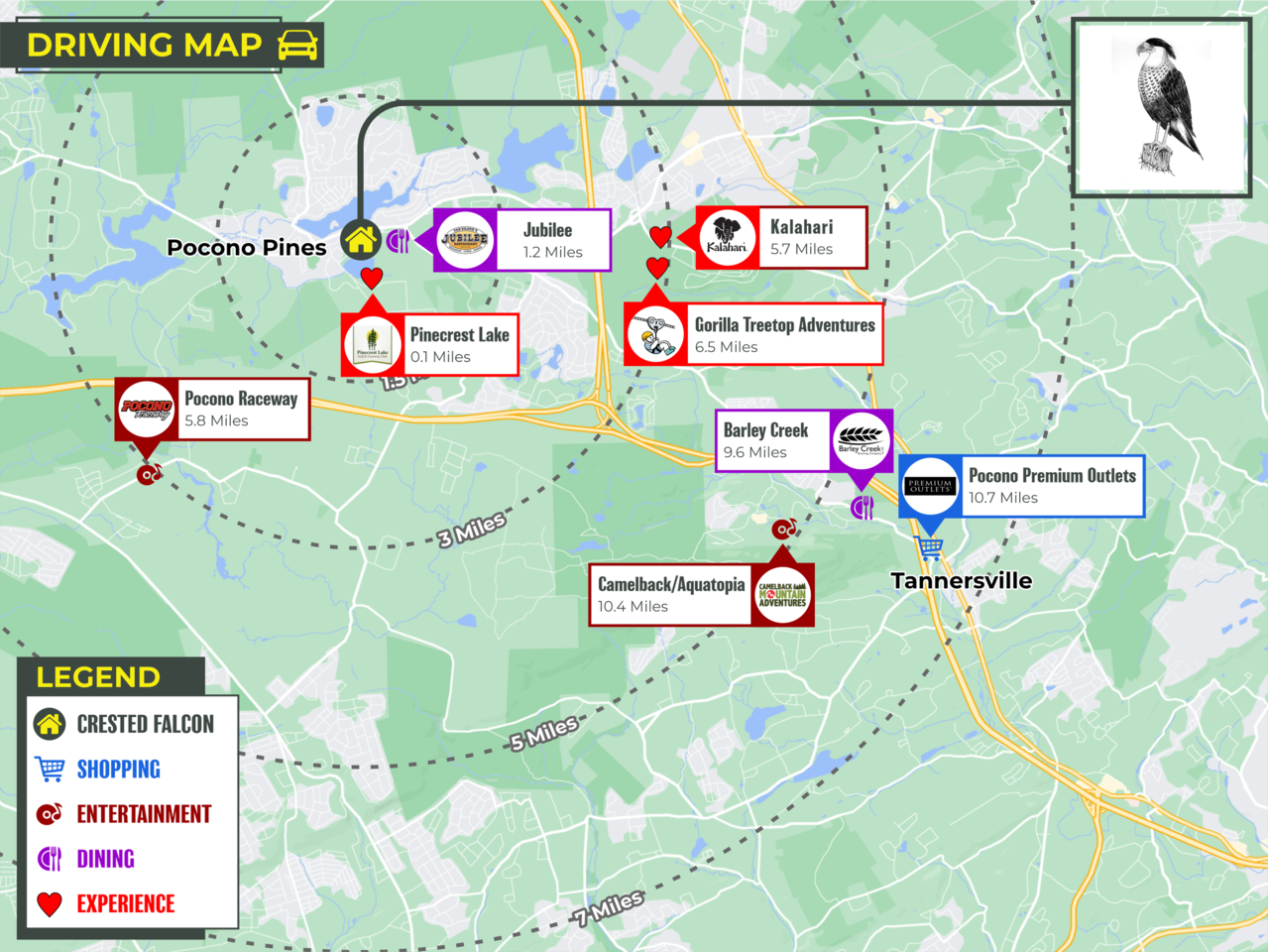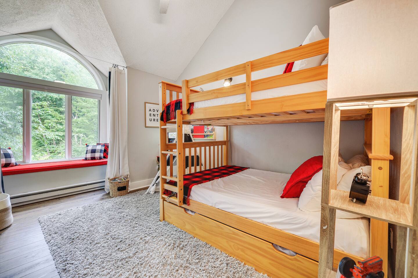 A redefined lakeview townhome designed for discerning families and groups who value comfort, design, and direct access to resort-quality amenities. Enjoy top-tier seasonal offerings via included private club membership — all just a short walk away: ✦ Oversized outdoor pool with slide, Baja ledge, and lap lanes (open late June–Labor Day) ✦ Sandy beach with lake swim dock ✦ 8 pickleball courts and 6 Har-Tru tennis courts ✦ Access to a par-72, 18-hole golf course (green fees apply) ✦ Private clubhouse dining The Home You’ll park steps away in two dedicated spots — including one with a complimentary Level 2 EV charger — and enter a spacious two-story home fully equipped for relaxing, entertaining, and working remotely. ►►►Main Level Features◄◄◄ ➜ Fully renovated kitchen with olive cabinetry, granite counters, and stainless steel appliances ➜ Live-edge dining table seats 8 comfortably ➜ Living room with buttery leather seating ➜ Electric fireplace with auxiliary heat ➜ 65" 4K Roku Smart TV with Sonos soundbar ➜ Wet bar and coffee station ➜ Powder room off the entry hall ➜ Multispeed Ceiling fan ➜ Individually wall-controlled Minisplit HVAC with A/C & heat ★★★★★ Lakeside deck ★★★★★ • Bistro table for two • Conversation chairs + side table • 3-burner Weber propane grill • Propane fire pit • Outdoor games and spare propane tank stored in closet ►►►Upper Level Sleeping Quarters◄◄◄ All three bedrooms feature cathedral ceilings, zoned ductless mini-split heating and cooling, ceiling fans, remote-controlled tower fans, personal Sonos speakers, and fast-charging USB ports. ★★★★★ Primary Suite (Sleeps 2)★★★★★ ➜ King canopy bed with luxury bamboo blend linens and cool-gel memory foam mattress ➜ 65” 4K Roku Smart TV with Sonos soundbar ➜ Auxiliary heat & cozy ambiance electric fireplace ➜ Private office desk setup with task lighting and USB ports ➜ Private coffee station with Keurig & essentials ➜ Ensuite bath with oversized rain shower + bidet ➜ Full closet with mini fridge, safe, steamer, and hamper ➜ Multispeed Ceiling fan ➜ Individually wall-controlled Minisplit HVAC with A/C & heat ★★★★★ Queen Bedroom (Sleeps 2)★★★★★ ➜ Queen bed with cool-gel memory foam mattress & bold green accent wall ➜ White bamboo blend linens ➜ Bedside charging stations and Sonos One ➜ Multispeed Ceiling fan ➜ Individually wall-controlled Minisplit HVAC with A/C & heat ★★★★★ Bunk Room (Sleeps 5)★★★★★ ➜ Double full bunk beds with twin trundle ➜ Bedside USB charging station ➜ Window seat ➜ Kid tent ➜ 55" 4K Roku Smart TV with Sonos soundbar ➜ Retro Pac-Man arcade game ➜ Multispeed Ceiling fan ➜ Individually wall-controlled Minisplit HVAC with A/C & heat A shared hallway bathroom with tub/shower combo serves the Queen and Bunk rooms, and a full-size LG washer/dryer with detergent is conveniently located at the end of the hall. ►►►Kitchen & Culinary Comforts◄◄◄ Whether you're prepping family meals or enjoying a quick breakfast, the kitchen is stocked for ease and comfort: ◻ Drip coffee maker (filters included), Keurig, pour-over pot, coffee bean grinder + complimentary ground coffee blend ◻ Full cookware set, Instant Pot, toaster, griddle, waffle maker, blender, air fryer, tea kettle, knives, cutting boards & kitchen gadgets ◻ Table service for 12 ◻ Pantry basics like spices, oils, baking essentials, and storage wrap ►►►Tech, Games & Comforts◄◄◄ ◻ Mesh Wi-Fi with blazing 400MB download speeds / 20MB upload ◻ 3 Smart TVs with Roku (Living Room, Primary Suite, Bunk Room) ◻ 4 Sonos zones (Living Room + all 3 bedrooms) ◻ Amazon Echo Show with Alexa voice assistance ◻ Charging stations and USB-integrated outlets at every bedside ◻ Board games, books, toys, high chairs, Pack & Play/travel crib with sheet ◻ 6 Tommy Bahama backpack beach chairs + beach umbrella & cooler ◻ 4 full-size umbrellas for rainy days ►►►Community & Location◄◄◄ Located in the Pinecrest Golf and Country Club community, you’ll have easy seasonal access to: Golf, tennis, pickleball, basketball, lake swimming, and pool Auxiliary parking 1,500 feet from the unit if needed The Crested Falcon is extremely close to activities for adults or the entire family. Our digital welcome guide will provide you information about the home and the community. Nearby area highlights include: - Kalahari Waterpark (13 mins away) - Jack Frost Ski Resort (18 mins away) - Mt Airy Casino (17 mins away) - Camel Beach & Aquatopia (18 mins away) - Pocono Raceway (12 mins away) - Mountain Creek Riding Stables (20 mins away) - Whitewater Challengers Rafting (38 mins away) - Tannersville Premium Outlet Shopping (21 mins away) - Stock Car Racing Experience (17 mins away) - Pocono Whitewater Rafting (29 mins away) - Skytop Ziplining (33 mins away) Provided Essentials Cleaning & Hygiene: ─ Bamboo blend linens, Quality cotton towels, dedicated lake/pool towels ─ Toilet paper, paper towels ─ Meyer's brand soaps and detergents ─ Hair dryer, iron, steamer ironing board, dish sponge, trash bags Kids & Extras: ─ Pack & Play / Travel Crib with sheet ─ High chair conversion kits ─ Toys, games, and books Outdoors: ─ Grill tools ─ Beach and lake day gear (chairs, cooler, umbrella) ─ Covered lakeview deck with fire pit and comfy seating We welcome adults that are 29 years or older (or traveling with their families) and require a signed rental agreement to fully confirm your booking that will include a copy of your government issued ID. Tobyhanna Township Ordinance STR Capacity Limit 8 for stays 30 days or less. Monroe County Hotel Room Excise Rental Tax # XX-X892. PA State Sales Tax License # XXXXX790. Tobyhanna STR Permit # 016448.