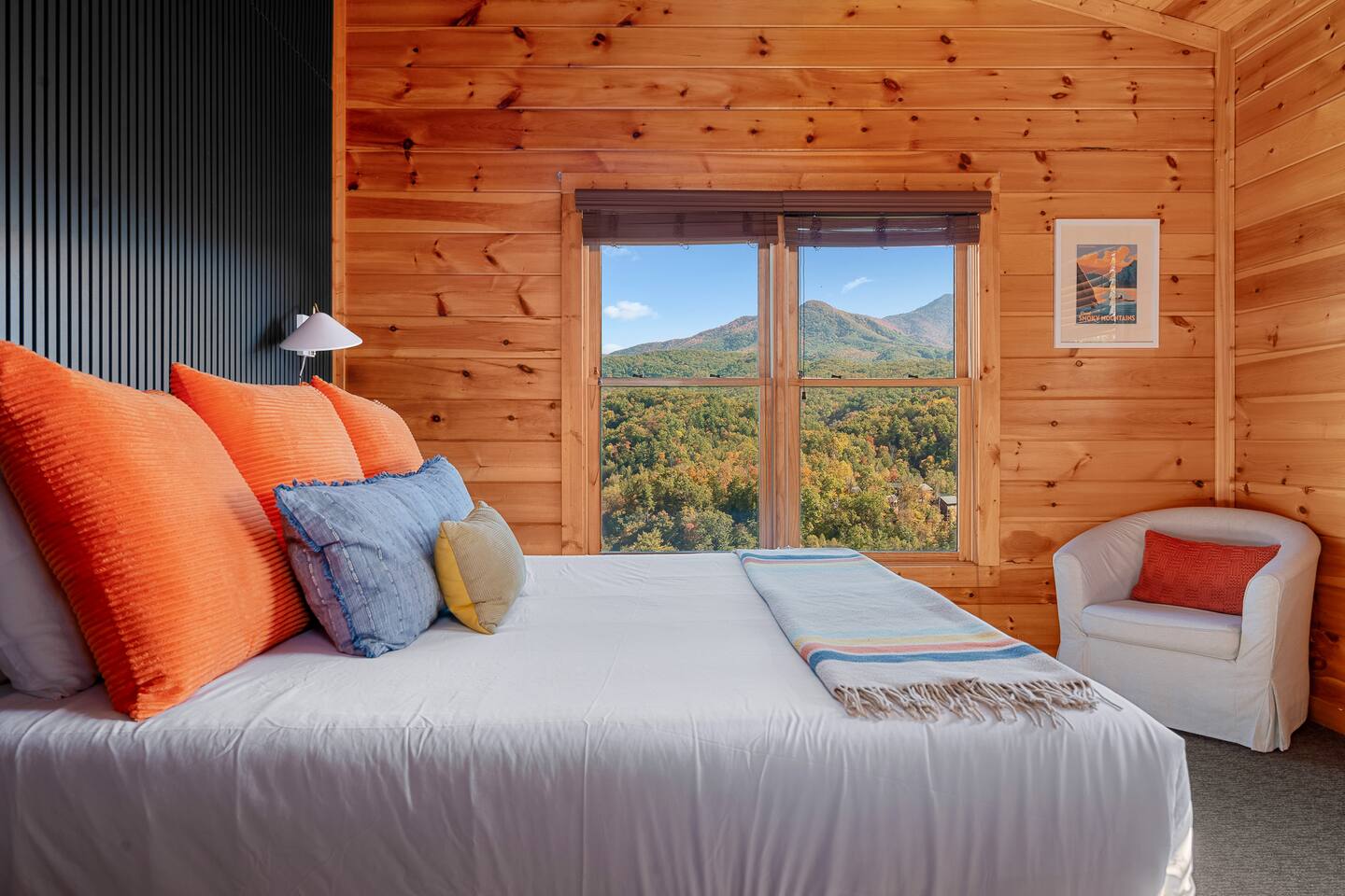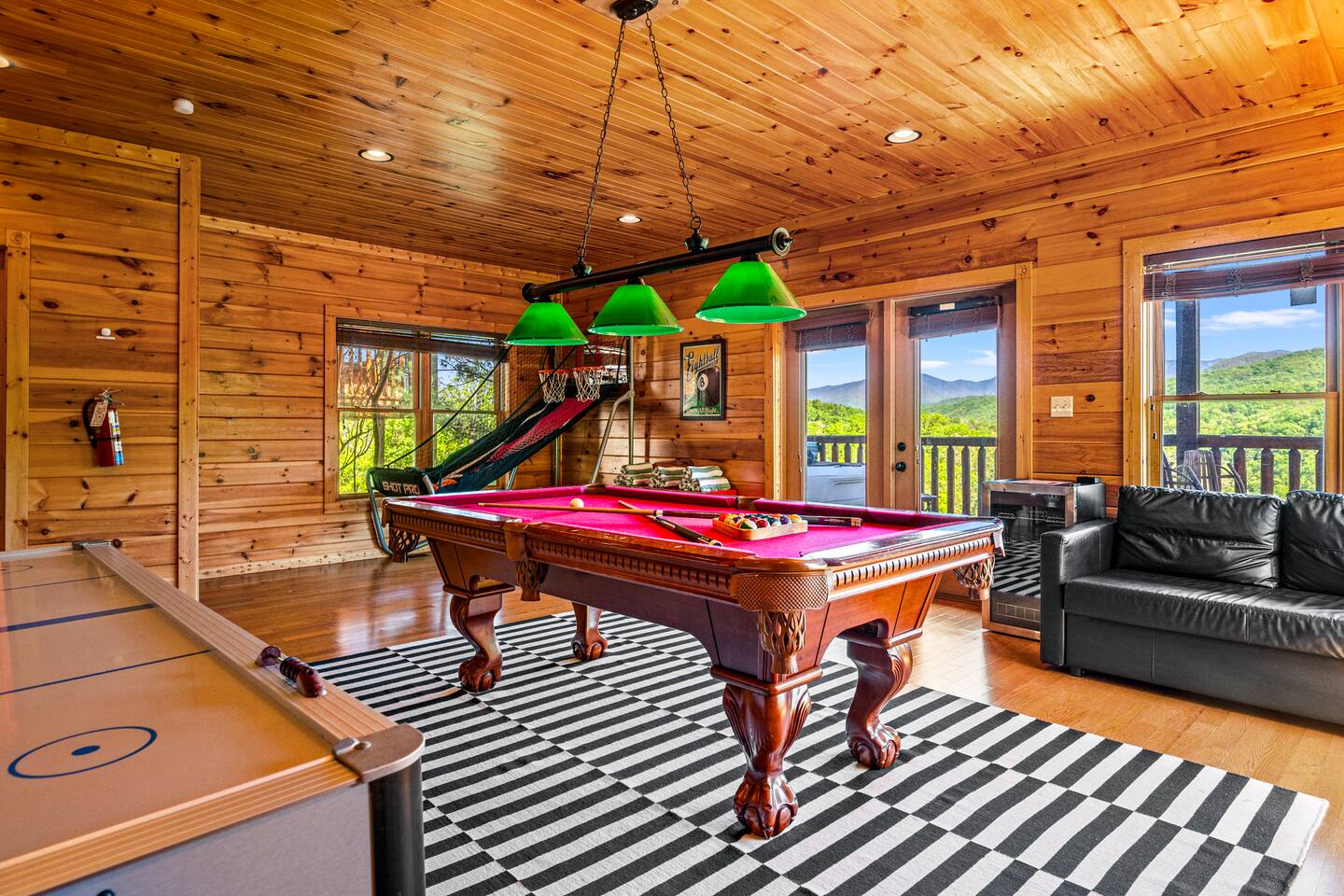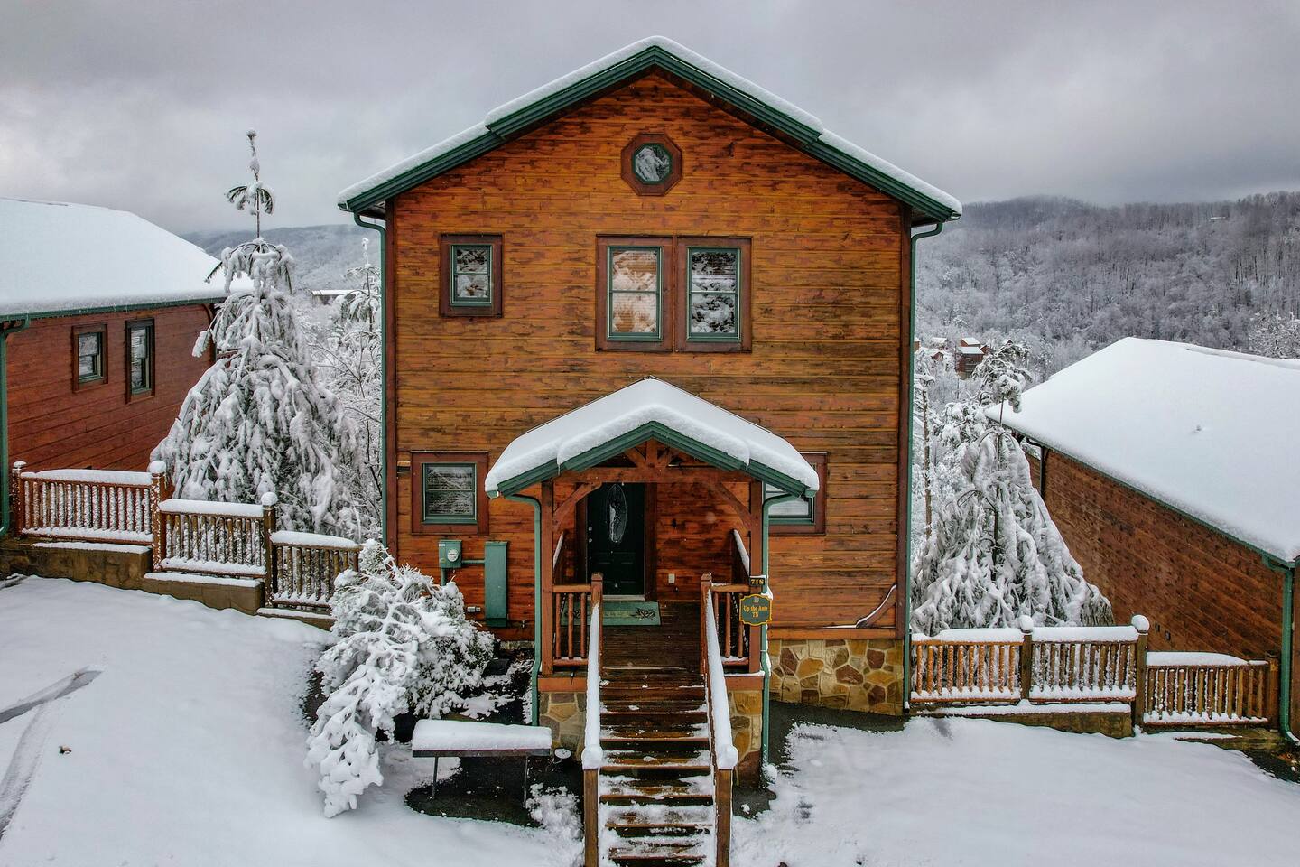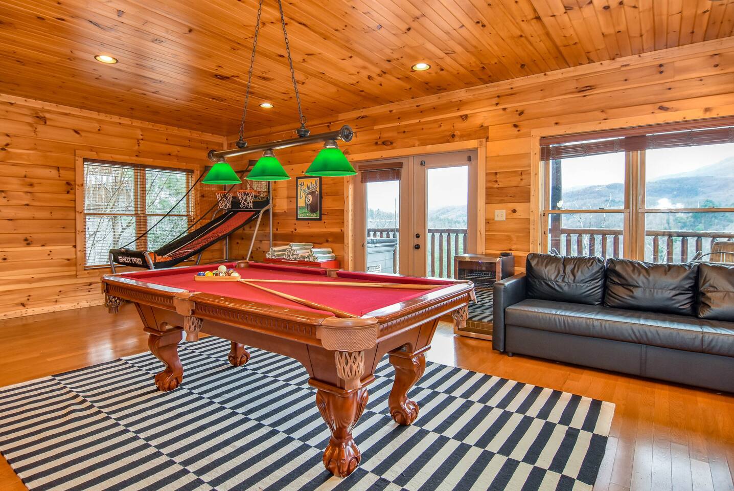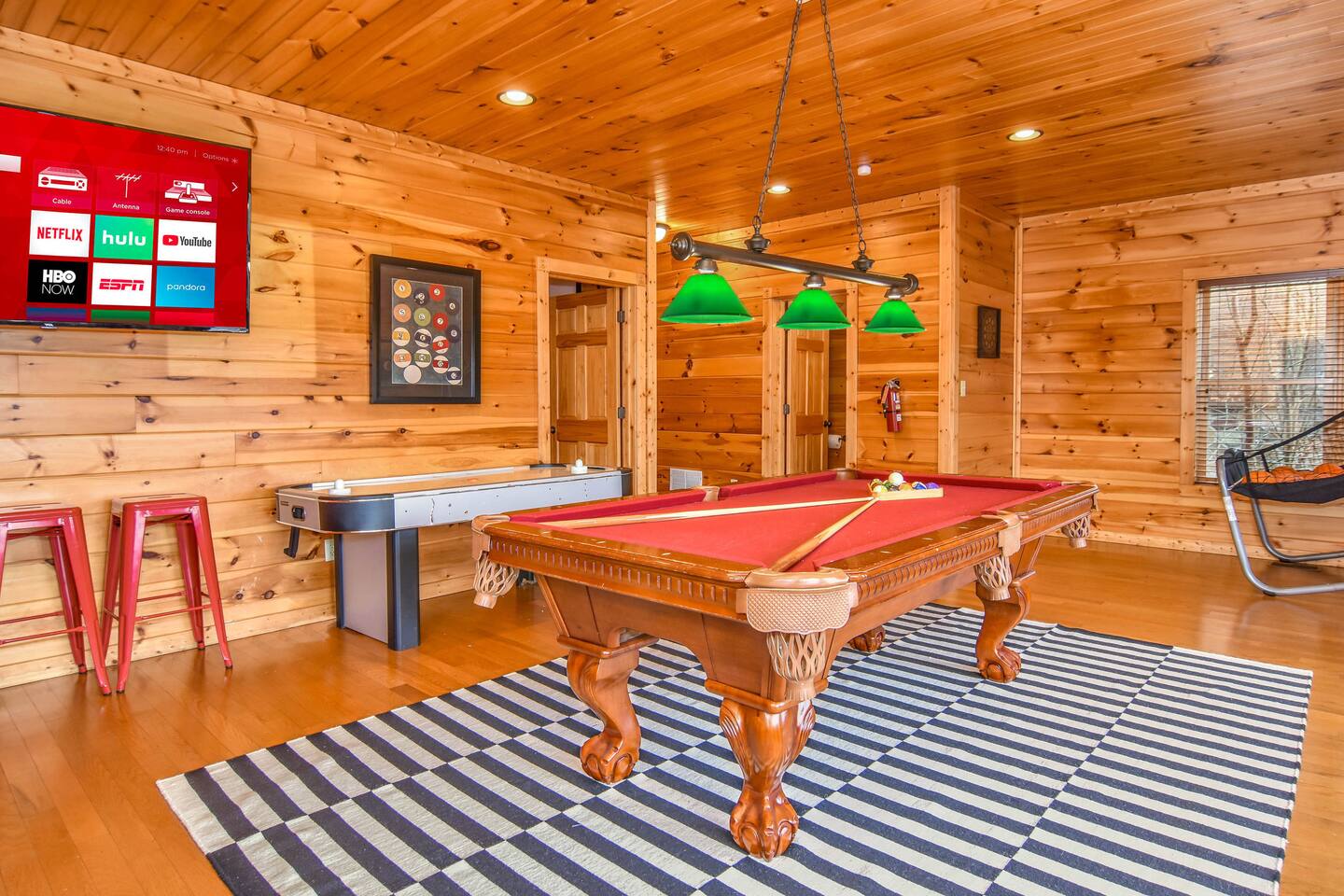 A modern farmhouse inspired cabin in the Gatlinburg Falls Parkview community designed for families traveling together that enjoy the creature comforts of home and a smart design aesthetic (upgraded winter '20). An easy drive just minutes from downtown Gatlinburg up gradual hills (not steep twisty drives like other cabins) along all paved roads that will immediately surprise you with glorious Smoky Mountain Views from all directions (including a Space Needle peek from our entry deck). Four master bedrooms all with private en-suite bathrooms and an entire gaming floor including a dedicated 9 person theater! LIVING SPACE: Our great room is on the main entry level and has a full size extended dining table with comfortable seating for at least 10. Additional seating is easily available at the island in the adjacent kitchen. The living room has a large sofa, a loveseat and and two side chairs arranged around the safe electric fireplace, 55" 4K Smart TV, blu-ray player and Sonos Beam Soundbar speaker. COOKING SPACE: The extra-large kitchen has a full size refrigerator and freezer, electric range/oven, microwave, dishwasher and sink with garbage disposal. There is ample storage made available during your stay so you can stock up easily and cook for your friends and family inside or out (large charcoal grill available directly next to our entry deck). GAMING SPACE: We're pleased to offer many fun games and activities during your stay. Grab a drink from the dedicated beverage cooler next to the leather pull-out couch and challenge a friend to any of the great games. We've outfitted the game floor with incredible creature comforts including head-to-head Pop-A-Shot basketball, full size regulation pool table, air hockey, chess/checkers table, full-size Multicade arcade game with 20+ arcade classics, 65" 4K Smart TV with cable and streaming choices. Directly next to the open gaming space you'll find a 9-person, stadium seating theater complete with a projected 125" screen and Dolby Digital THX Surround Sound. Watch a dizzying array of movies from our private Plex media server or stream from one of the many services available for access including Netflix, Hulu, Amazon Prime and more. Directly outside on the game floor deck you'll find our new 7 person hot tub with an incredible view of the Great Smoky Mountains and additional rocking chairs for relaxing. SLEEPING SPACE: We've outfitted all bedrooms to maximize you privacy, comfort and conveniences. Each room will have a wall-mounted 55" or 65" Roku 4K Smart TVs complete with cable and streaming access, a ceiling fan and individual bedside A/C + USB-C/A charging stations. A closet includes hanging shelves, clothing hangers and a luggage rack with laundry basket. Each individually designed bed features a cool-gel memory foam mattress, a stylish throw, decorative pillows and is fitted with luxurious, eco-friendly bamboo blend linens with two pillows per person (including soft and firm choices). Connected privately to each bedroom is a full en-suite bathroom with combination shower/tub with body sprayers and toiletries including complimentary hand-selected body wash, shampoo and conditioner. ★★★★★ Alpine Suite ★★★★★ The spacious grand master king bedroom (accommodates 2 people) is entered on the left and has North and East facing windows overlooking majestic views of the Great Smoky Mountains all the way to the Carolinas. Inside you'll find a comfy wingback chair, individual nightstands and reading lamps - perfect for a late night read and a glass of wine. ★★★★★ Summit Suite ★★★★★ The second bedroom to your left is also a large master king with windows facing East and South for incredible unobstructed views of the Great Smoky Mountains surrounding Gatlinburg and Anakeesta (accommodates 2 people). Individual nightstands flank each side of the bed as well as a plush barrel chair perfect to curl up with a book while the sun sets. ★★★★★ Vista Suite ★★★★★ The first bedroom to your right at the top of the stairs is a master king bedroom facing West with lush foliage on the bluff adjacent to the cabin. This bedroom includes individual nightstands on each side of the bed as well as a soft side chair to relax in. ★★★★★ Cub Den Bunk Suite ★★★★★ Entering the second room on your right, the kids (or additional adults) get first class treatment in the bunk room where dual full size bunk beds give them ample sleeping room (accommodates 4 people). South and West facing windows give you a view of the Gatlinburg Space Needle along with the Smoky Mountains surrounding downtown. A whimsical tent at the foot of the beds gives the kids a private hideaway for maximum relaxing. The entire home has Mesh WiFi with 250MB down high-speed internet for fast speeds for all of your devices. PARKING: On-site parking for up to four vehicles directly in front of the cabin is available. Level 2 Fast EV Charging station available for use during your stay. Up the Ante TN Cabin is extremely close to activities for adults or the entire family. Our digital welcome guide will provide you information about the home and the community. OTHER THINGS TO NOTE: By The Stats - General Starter Items provided at the house HYGIENE & CLEANING : • Cozy and complete Bamboo bed linens and pillows • Egyptian cotton bath towels and hand towels per person • 3 rolls of toilet paper per bathroom • 3 rolls of paper towels • Meyer's Hand soap, dish soap, dishwasher soap, laundry detergent, body wash, shampoo & conditioner • 1 dish sponge • 4 garbage bags • Hair dryer • Steamer COOKING & CULINARY CONVENIENCES : • Complete table service for 12 guests • Programmable coffee maker & combination Keurig + complimentary custom blend ground coffee (filters included) • Tea Kettle • Pots and pans • Toaster & Waffle Iron • Blender • Large serving bowls and a salad bowl • Additional items typically include salt, pepper