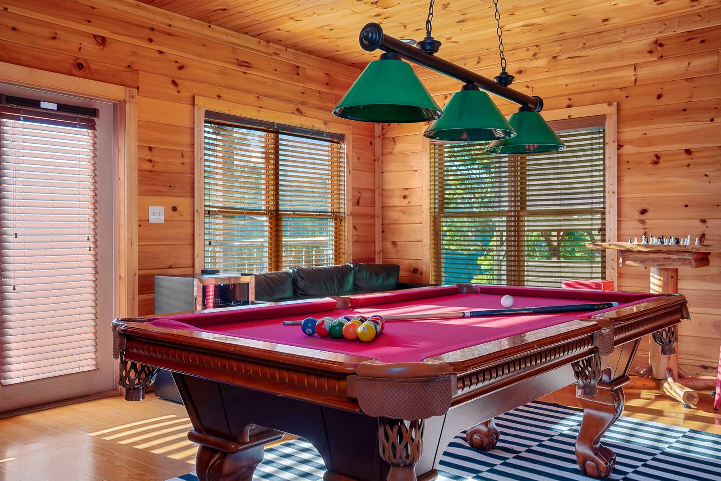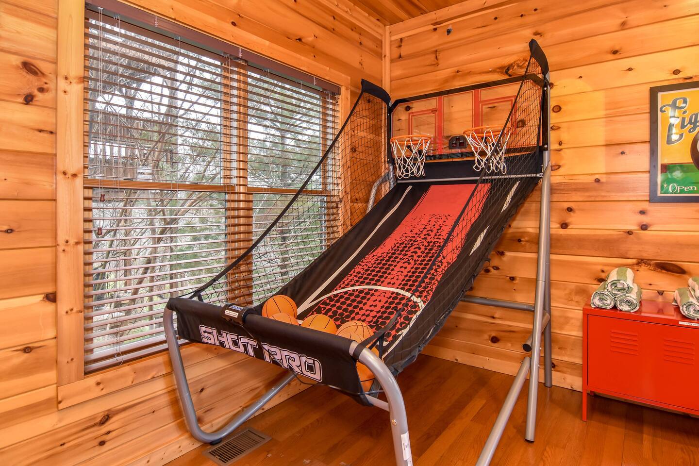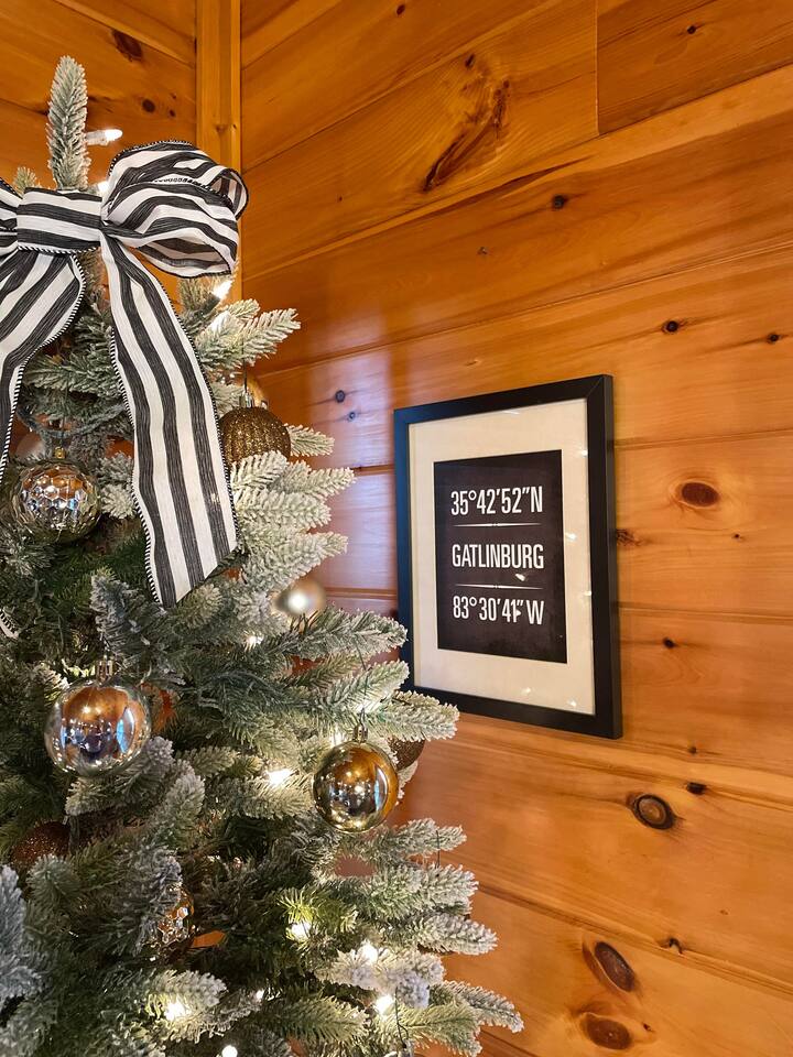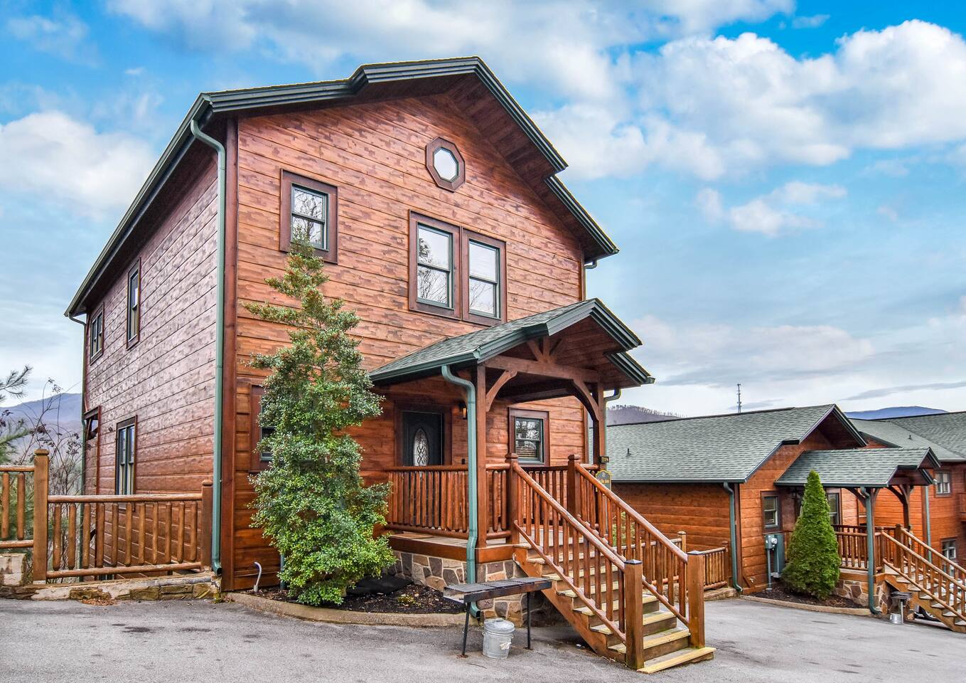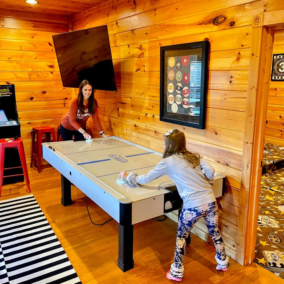 A modern farmhouse inspired cabin in the Gatlinburg Falls Parkview community designed for families traveling together that enjoy the creature comforts of home and a smart design aesthetic (upgraded winter '20). An easy drive just minutes from downtown Gatlinburg up gradual hills (not steep twisty drives like other cabins) along all paved roads that will immediately surprise you with glorious Smoky Mountain Views from all directions (including a Space Needle peek from our entry deck). Four master bedrooms all with private en-suite bathrooms and an entire gaming floor including a dedicated 9 person theater! LIVING SPACE: Our great room is on the main entry level and has a full size extended dining table with comfortable seating for at least 10. Additional seating is easily available at the island in the adjacent kitchen. The living room has a large sofa, a loveseat and and two side chairs arranged around the safe electric fireplace, 55" 4K Smart TV, blu-ray player and Sonos Beam Soundbar speaker. COOKING SPACE: The extra-large kitchen has a full size refrigerator and freezer, electric range/oven, microwave, dishwasher and sink with garbage disposal. There is ample storage made available during your stay so you can stock up easily and cook for your friends and family inside or out (large charcoal grill available directly next to our entry deck). GAMING SPACE: We're pleased to offer many fun games and activities during your stay. Grab a drink from the dedicated beverage cooler next to the leather pull-out couch and challenge a friend to any of the great games. We've outfitted the game floor with incredible creature comforts including head-to-head Pop-A-Shot basketball, full size regulation pool table, air hockey, chess/checkers table, full-size Multicade arcade game with 20+ arcade classics, 65" 4K Smart TV with cable and streaming choices. Directly next to the open gaming space you'll find a 9-person, stadium seating theater complete with a projected 125" screen and Dolby Digital THX Surround Sound. Watch a dizzying array of movies from our private Plex media server or stream from one of the many services available for access including Netflix, Hulu, Amazon Prime and more. Directly outside on the game floor deck you'll find our new 7 person hot tub with an incredible view of the Great Smoky Mountains and additional rocking chairs for relaxing. SLEEPING SPACE: We've outfitted all bedrooms to maximize you privacy, comfort and conveniences. Each room will have a wall-mounted 55" or 65" Roku 4K Smart TVs complete with cable and streaming access, a ceiling fan and individual bedside A/C + USB-C/A charging stations. A closet includes hanging shelves, clothing hangers and a luggage rack with laundry basket. Each individually designed bed features a cool-gel memory foam mattress, a stylish throw, decorative pillows and is fitted with luxurious, eco-friendly bamboo blend linens with two pillows per person (including soft and firm choices). Connected privately to each bedroom is a full en-suite bathroom with combination shower/tub with body sprayers and toiletries including complimentary hand-selected body wash, shampoo and conditioner. ★★★★★ Alpine Suite ★★★★★ The spacious grand master king bedroom (accommodates 2 people) is entered on the left and has North and East facing windows overlooking majestic views of the Great Smoky Mountains all the way to the Carolinas. Inside you'll find a comfy wingback chair, individual nightstands and reading lamps - perfect for a late night read and a glass of wine. ★★★★★ Summit Suite ★★★★★ The second bedroom to your left is also a large master king with windows facing East and South for incredible unobstructed views of the Great Smoky Mountains surrounding Gatlinburg and Anakeesta (accommodates 2 people). Individual nightstands flank each side of the bed as well as a plush barrel chair perfect to curl up with a book while the sun sets. ★★★★★ Vista Suite ★★★★★ The first bedroom to your right at the top of the stairs is a master king bedroom facing West with lush foliage on the bluff adjacent to the cabin. This bedroom includes individual nightstands on each side of the bed as well as a soft side chair to relax in. ★★★★★ Cub Den Bunk Suite ★★★★★ Entering the second room on your right, the kids (or additional adults) get first class treatment in the bunk room where dual full size bunk beds give them ample sleeping room (accommodates 4 people). South and West facing windows give you a view of the Gatlinburg Space Needle along with the Smoky Mountains surrounding downtown. A whimsical tent at the foot of the beds gives the kids a private hideaway for maximum relaxing. The entire home has Mesh WiFi with 250MB down high-speed internet for fast speeds for all of your devices. PARKING: On-site parking for up to four vehicles directly in front of the cabin is available. Level 2 Fast EV Charging station available for use during your stay. Up the Ante TN Cabin is extremely close to activities for adults or the entire family. Our digital welcome guide will provide you information about the home and the community. OTHER THINGS TO NOTE: By The Stats - General Starter Items provided at the house HYGIENE & CLEANING : • Cozy and complete Bamboo bed linens and pillows • Egyptian cotton bath towels and hand towels per person • 3 rolls of toilet paper per bathroom • 3 rolls of paper towels • Meyer's Hand soap, dish soap, dishwasher soap, laundry detergent, body wash, shampoo & conditioner • 1 dish sponge • 4 garbage bags • Hair dryer • Steamer COOKING & CULINARY CONVENIENCES : • Complete table service for 12 guests • Programmable coffee maker & combination Keurig + complimentary custom blend ground coffee (filters included) • Tea Kettle • Pots and pans • Toaster & Waffle Iron • Blender • Large serving bowls and a salad bowl • Additional items typically include salt, pepper