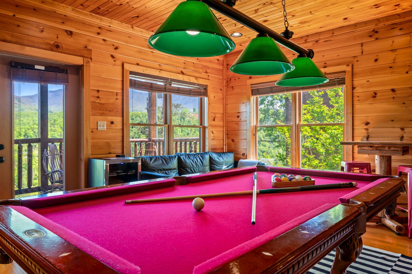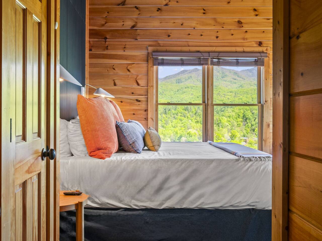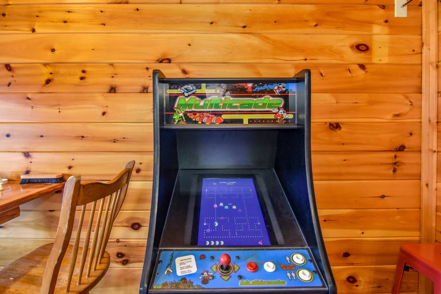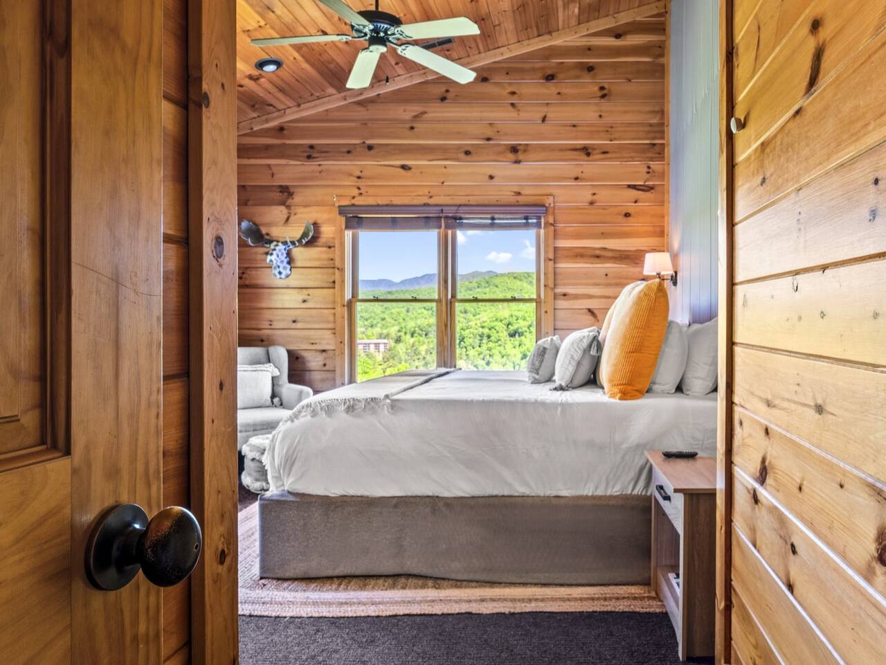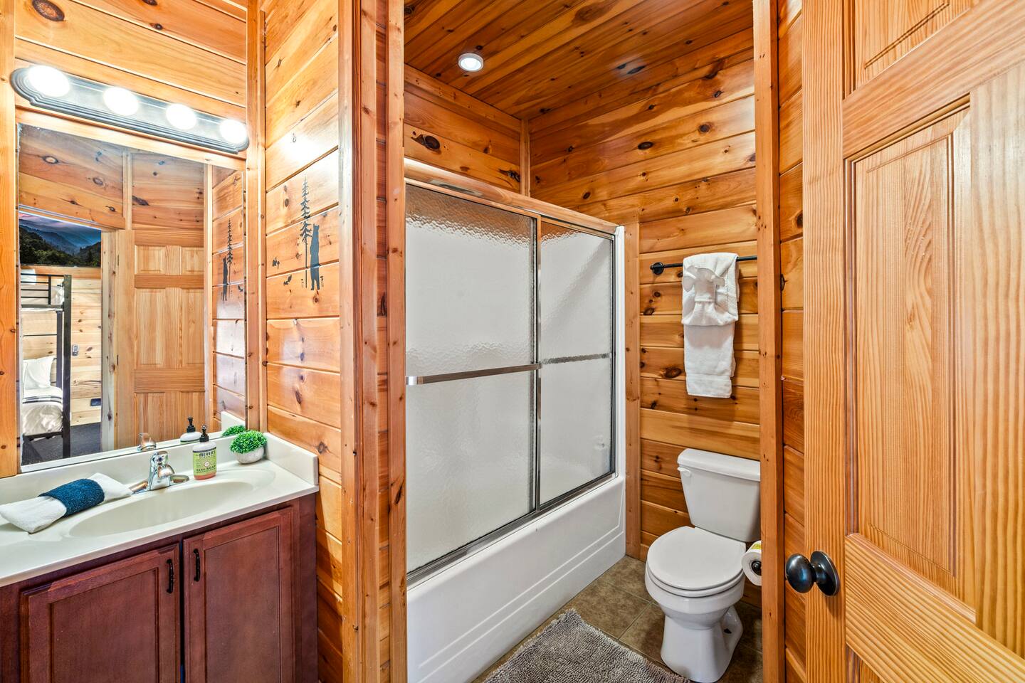 A modern farmhouse inspired cabin in the Gatlinburg Falls Parkview community designed for families traveling together that enjoy the creature comforts of home and a smart design aesthetic (upgraded winter '20). An easy drive just minutes from downtown Gatlinburg up gradual hills (not steep twisty drives like other cabins) along all paved roads that will immediately surprise you with glorious Smoky Mountain Views from all directions (including a Space Needle peek from our entry deck). Four master bedrooms all with private en-suite bathrooms and an entire gaming floor including a dedicated 9 person theater! LIVING SPACE: Our great room is on the main entry level and has a full size extended dining table with comfortable seating for at least 10. Additional seating is easily available at the island in the adjacent kitchen. The living room has a large sofa, a loveseat and and two side chairs arranged around the safe electric fireplace, 55" 4K Smart TV, blu-ray player and Sonos Beam Soundbar speaker. COOKING SPACE: The extra-large kitchen has a full size refrigerator and freezer, electric range/oven, microwave, dishwasher and sink with garbage disposal. There is ample storage made available during your stay so you can stock up easily and cook for your friends and family inside or out (large charcoal grill available directly next to our entry deck). GAMING SPACE: We're pleased to offer many fun games and activities during your stay. Grab a drink from the dedicated beverage cooler next to the leather pull-out couch and challenge a friend to any of the great games. We've outfitted the game floor with incredible creature comforts including head-to-head Pop-A-Shot basketball, full size regulation pool table, air hockey, chess/checkers table, full-size Multicade arcade game with 20+ arcade classics, 65" 4K Smart TV with cable and streaming choices. Directly next to the open gaming space you'll find a 9-person, stadium seating theater complete with a projected 125" screen and Dolby Digital THX Surround Sound. Watch a dizzying array of movies from our private Plex media server or stream from one of the many services available for access including Netflix, Hulu, Amazon Prime and more. Directly outside on the game floor deck you'll find our new 7 person hot tub with an incredible view of the Great Smoky Mountains and additional rocking chairs for relaxing. SLEEPING SPACE: We've outfitted all bedrooms to maximize you privacy, comfort and conveniences. Each room will have a wall-mounted 55" or 65" Roku 4K Smart TVs complete with cable and streaming access, a ceiling fan and individual bedside A/C + USB-C/A charging stations. A closet includes hanging shelves, clothing hangers and a luggage rack with laundry basket. Each individually designed bed features a cool-gel memory foam mattress, a stylish throw, decorative pillows and is fitted with luxurious, eco-friendly bamboo blend linens with two pillows per person (including soft and firm choices). Connected privately to each bedroom is a full en-suite bathroom with combination shower/tub with body sprayers and toiletries including complimentary hand-selected body wash, shampoo and conditioner. ★★★★★ Alpine Suite ★★★★★ The spacious grand master king bedroom (accommodates 2 people) is entered on the left and has North and East facing windows overlooking majestic views of the Great Smoky Mountains all the way to the Carolinas. Inside you'll find a comfy wingback chair, individual nightstands and reading lamps - perfect for a late night read and a glass of wine. ★★★★★ Summit Suite ★★★★★ The second bedroom to your left is also a large master king with windows facing East and South for incredible unobstructed views of the Great Smoky Mountains surrounding Gatlinburg and Anakeesta (accommodates 2 people). Individual nightstands flank each side of the bed as well as a plush barrel chair perfect to curl up with a book while the sun sets. ★★★★★ Vista Suite ★★★★★ The first bedroom to your right at the top of the stairs is a master king bedroom facing West with lush foliage on the bluff adjacent to the cabin. This bedroom includes individual nightstands on each side of the bed as well as a soft side chair to relax in. ★★★★★ Cub Den Bunk Suite ★★★★★ Entering the second room on your right, the kids (or additional adults) get first class treatment in the bunk room where dual full size bunk beds give them ample sleeping room (accommodates 4 people). South and West facing windows give you a view of the Gatlinburg Space Needle along with the Smoky Mountains surrounding downtown. A whimsical tent at the foot of the beds gives the kids a private hideaway for maximum relaxing. The entire home has Mesh WiFi with 250MB down high-speed internet for fast speeds for all of your devices. PARKING: On-site parking for up to four vehicles directly in front of the cabin is available. Level 2 Fast EV Charging station available for use during your stay. Up the Ante TN Cabin is extremely close to activities for adults or the entire family. Our digital welcome guide will provide you information about the home and the community. OTHER THINGS TO NOTE: By The Stats - General Starter Items provided at the house HYGIENE & CLEANING : • Cozy and complete Bamboo bed linens and pillows • Egyptian cotton bath towels and hand towels per person • 3 rolls of toilet paper per bathroom • 3 rolls of paper towels • Meyer's Hand soap, dish soap, dishwasher soap, laundry detergent, body wash, shampoo & conditioner • 1 dish sponge • 4 garbage bags • Hair dryer • Steamer COOKING & CULINARY CONVENIENCES : • Complete table service for 12 guests • Programmable coffee maker & combination Keurig + complimentary custom blend ground coffee (filters included) • Tea Kettle • Pots and pans • Toaster & Waffle Iron • Blender • Large serving bowls and a salad bowl • Additional items typically include salt, pepper