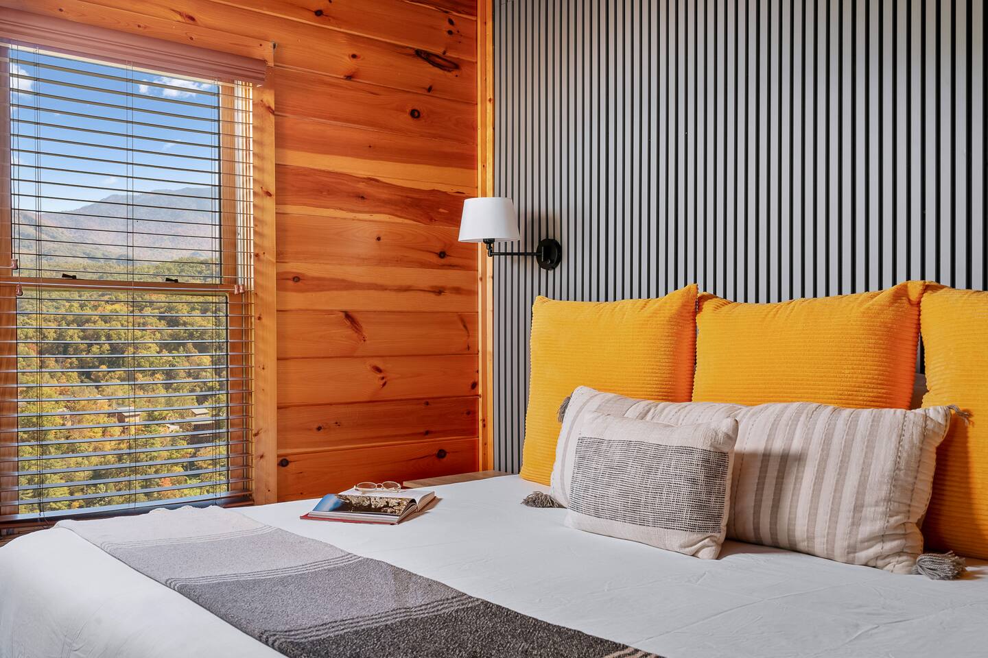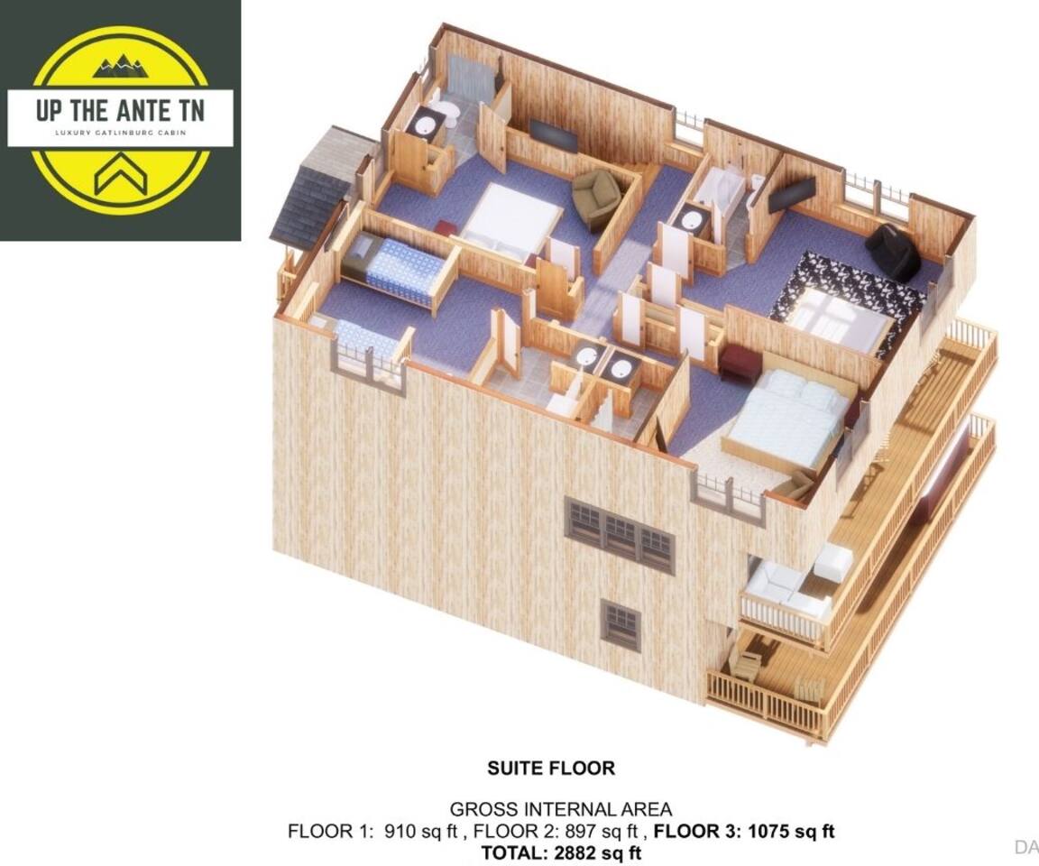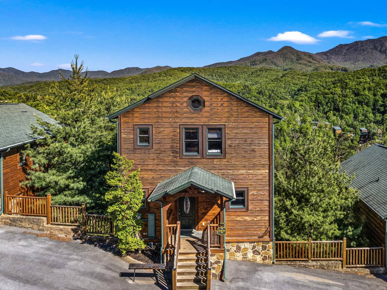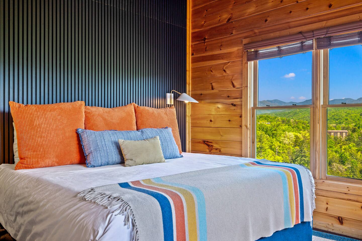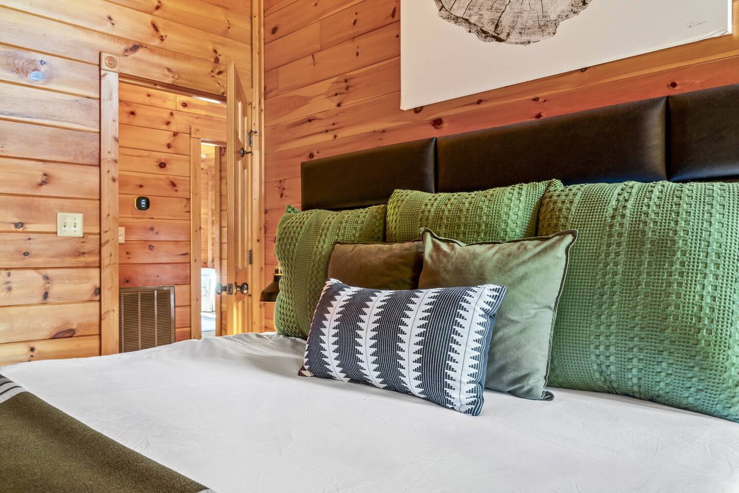 A modern farmhouse inspired cabin in the Gatlinburg Falls Parkview community designed for families traveling together that enjoy the creature comforts of home and a smart design aesthetic (upgraded winter '20). An easy drive just minutes from downtown Gatlinburg up gradual hills (not steep twisty drives like other cabins) along all paved roads that will immediately surprise you with glorious Smoky Mountain Views from all directions (including a Space Needle peek from our entry deck). Four master bedrooms all with private en-suite bathrooms and an entire gaming floor including a dedicated 9 person theater! LIVING SPACE: Our great room is on the main entry level and has a full size extended dining table with comfortable seating for at least 10. Additional seating is easily available at the island in the adjacent kitchen. The living room has a large sofa, a loveseat and and two side chairs arranged around the safe electric fireplace, 55" 4K Smart TV, blu-ray player and Sonos Beam Soundbar speaker. COOKING SPACE: The extra-large kitchen has a full size refrigerator and freezer, electric range/oven, microwave, dishwasher and sink with garbage disposal. There is ample storage made available during your stay so you can stock up easily and cook for your friends and family inside or out (large charcoal grill available directly next to our entry deck). GAMING SPACE: We're pleased to offer many fun games and activities during your stay. Grab a drink from the dedicated beverage cooler next to the leather pull-out couch and challenge a friend to any of the great games. We've outfitted the game floor with incredible creature comforts including head-to-head Pop-A-Shot basketball, full size regulation pool table, air hockey, chess/checkers table, full-size Multicade arcade game with 20+ arcade classics, 65" 4K Smart TV with cable and streaming choices. Directly next to the open gaming space you'll find a 9-person, stadium seating theater complete with a projected 125" screen and Dolby Digital THX Surround Sound. Watch a dizzying array of movies from our private Plex media server or stream from one of the many services available for access including Netflix, Hulu, Amazon Prime and more. Directly outside on the game floor deck you'll find our new 7 person hot tub with an incredible view of the Great Smoky Mountains and additional rocking chairs for relaxing. SLEEPING SPACE: We've outfitted all bedrooms to maximize you privacy, comfort and conveniences. Each room will have a wall-mounted 55" or 65" Roku 4K Smart TVs complete with cable and streaming access, a ceiling fan and individual bedside A/C + USB-C/A charging stations. A closet includes hanging shelves, clothing hangers and a luggage rack with laundry basket. Each individually designed bed features a cool-gel memory foam mattress, a stylish throw, decorative pillows and is fitted with luxurious, eco-friendly bamboo blend linens with two pillows per person (including soft and firm choices). Connected privately to each bedroom is a full en-suite bathroom with combination shower/tub with body sprayers and toiletries including complimentary hand-selected body wash, shampoo and conditioner. ★★★★★ Alpine Suite ★★★★★ The spacious grand master king bedroom (accommodates 2 people) is entered on the left and has North and East facing windows overlooking majestic views of the Great Smoky Mountains all the way to the Carolinas. Inside you'll find a comfy wingback chair, individual nightstands and reading lamps - perfect for a late night read and a glass of wine. ★★★★★ Summit Suite ★★★★★ The second bedroom to your left is also a large master king with windows facing East and South for incredible unobstructed views of the Great Smoky Mountains surrounding Gatlinburg and Anakeesta (accommodates 2 people). Individual nightstands flank each side of the bed as well as a plush barrel chair perfect to curl up with a book while the sun sets. ★★★★★ Vista Suite ★★★★★ The first bedroom to your right at the top of the stairs is a master king bedroom facing West with lush foliage on the bluff adjacent to the cabin. This bedroom includes individual nightstands on each side of the bed as well as a soft side chair to relax in. ★★★★★ Cub Den Bunk Suite ★★★★★ Entering the second room on your right, the kids (or additional adults) get first class treatment in the bunk room where dual full size bunk beds give them ample sleeping room (accommodates 4 people). South and West facing windows give you a view of the Gatlinburg Space Needle along with the Smoky Mountains surrounding downtown. A whimsical tent at the foot of the beds gives the kids a private hideaway for maximum relaxing. The entire home has Mesh WiFi with 250MB down high-speed internet for fast speeds for all of your devices. PARKING: On-site parking for up to four vehicles directly in front of the cabin is available. Level 2 Fast EV Charging station available for use during your stay. Up the Ante TN Cabin is extremely close to activities for adults or the entire family. Our digital welcome guide will provide you information about the home and the community. OTHER THINGS TO NOTE: By The Stats - General Starter Items provided at the house HYGIENE & CLEANING : • Cozy and complete Bamboo bed linens and pillows • Egyptian cotton bath towels and hand towels per person • 3 rolls of toilet paper per bathroom • 3 rolls of paper towels • Meyer's Hand soap, dish soap, dishwasher soap, laundry detergent, body wash, shampoo & conditioner • 1 dish sponge • 4 garbage bags • Hair dryer • Steamer COOKING & CULINARY CONVENIENCES : • Complete table service for 12 guests • Programmable coffee maker & combination Keurig + complimentary custom blend ground coffee (filters included) • Tea Kettle • Pots and pans • Toaster & Waffle Iron • Blender • Large serving bowls and a salad bowl • Additional items typically include salt, pepper