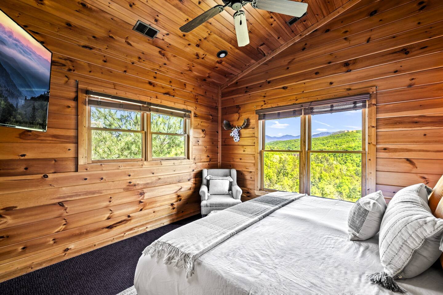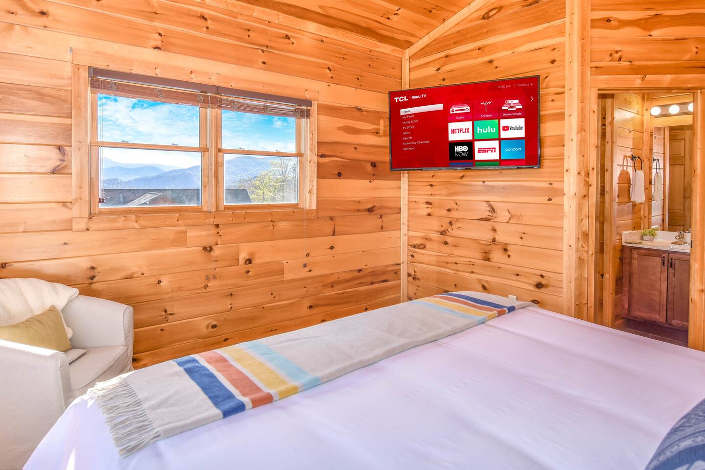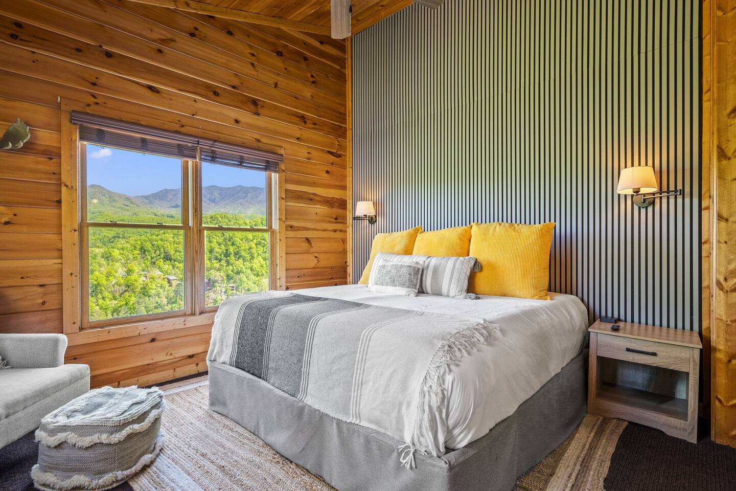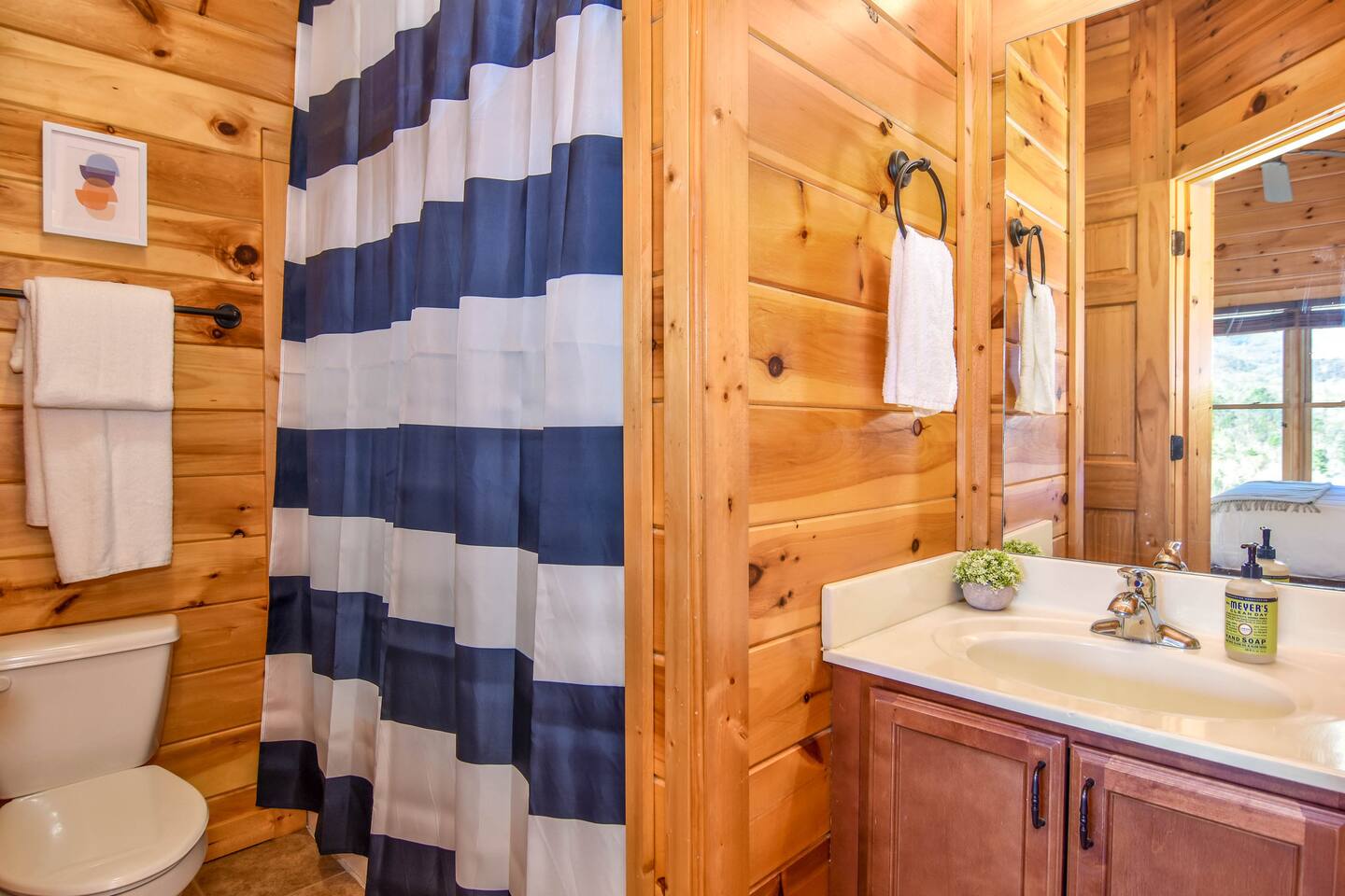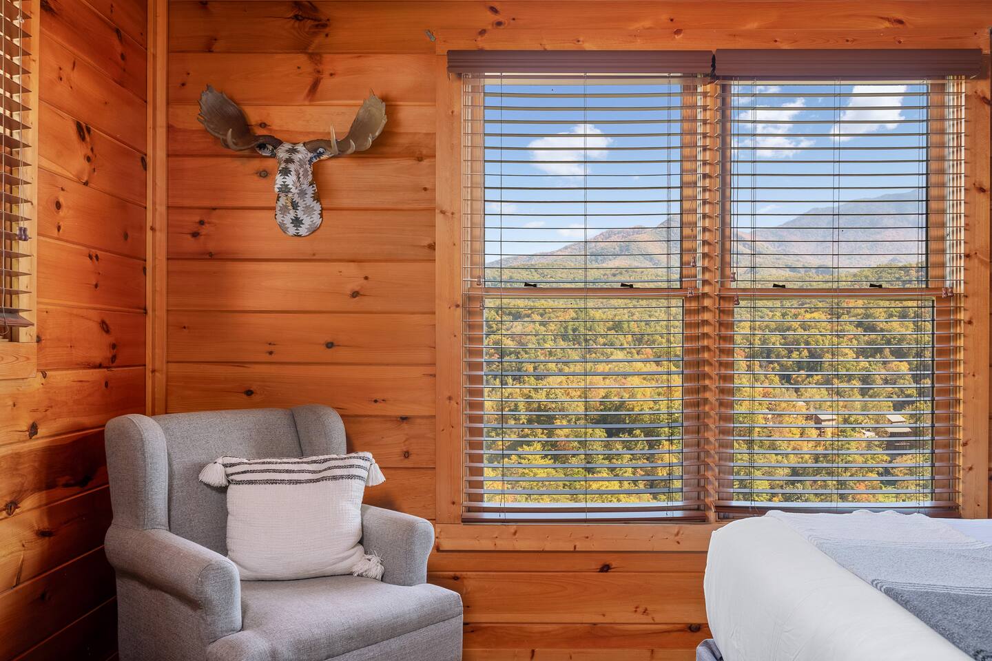 A modern farmhouse inspired cabin in the Gatlinburg Falls Parkview community designed for families traveling together that enjoy the creature comforts of home and a smart design aesthetic (upgraded winter '20). An easy drive just minutes from downtown Gatlinburg up gradual hills (not steep twisty drives like other cabins) along all paved roads that will immediately surprise you with glorious Smoky Mountain Views from all directions (including a Space Needle peek from our entry deck). Four master bedrooms all with private en-suite bathrooms and an entire gaming floor including a dedicated 9 person theater! LIVING SPACE: Our great room is on the main entry level and has a full size extended dining table with comfortable seating for at least 10. Additional seating is easily available at the island in the adjacent kitchen. The living room has a large sofa, a loveseat and and two side chairs arranged around the safe electric fireplace, 55" 4K Smart TV, blu-ray player and Sonos Beam Soundbar speaker. COOKING SPACE: The extra-large kitchen has a full size refrigerator and freezer, electric range/oven, microwave, dishwasher and sink with garbage disposal. There is ample storage made available during your stay so you can stock up easily and cook for your friends and family inside or out (large charcoal grill available directly next to our entry deck). GAMING SPACE: We're pleased to offer many fun games and activities during your stay. Grab a drink from the dedicated beverage cooler next to the leather pull-out couch and challenge a friend to any of the great games. We've outfitted the game floor with incredible creature comforts including head-to-head Pop-A-Shot basketball, full size regulation pool table, air hockey, chess/checkers table, full-size Multicade arcade game with 20+ arcade classics, 65" 4K Smart TV with cable and streaming choices. Directly next to the open gaming space you'll find a 9-person, stadium seating theater complete with a projected 125" screen and Dolby Digital THX Surround Sound. Watch a dizzying array of movies from our private Plex media server or stream from one of the many services available for access including Netflix, Hulu, Amazon Prime and more. Directly outside on the game floor deck you'll find our new 7 person hot tub with an incredible view of the Great Smoky Mountains and additional rocking chairs for relaxing. SLEEPING SPACE: We've outfitted all bedrooms to maximize you privacy, comfort and conveniences. Each room will have a wall-mounted 55" or 65" Roku 4K Smart TVs complete with cable and streaming access, a ceiling fan and individual bedside A/C + USB-C/A charging stations. A closet includes hanging shelves, clothing hangers and a luggage rack with laundry basket. Each individually designed bed features a cool-gel memory foam mattress, a stylish throw, decorative pillows and is fitted with luxurious, eco-friendly bamboo blend linens with two pillows per person (including soft and firm choices). Connected privately to each bedroom is a full en-suite bathroom with combination shower/tub with body sprayers and toiletries including complimentary hand-selected body wash, shampoo and conditioner. ★★★★★ Alpine Suite ★★★★★ The spacious grand master king bedroom (accommodates 2 people) is entered on the left and has North and East facing windows overlooking majestic views of the Great Smoky Mountains all the way to the Carolinas. Inside you'll find a comfy wingback chair, individual nightstands and reading lamps - perfect for a late night read and a glass of wine. ★★★★★ Summit Suite ★★★★★ The second bedroom to your left is also a large master king with windows facing East and South for incredible unobstructed views of the Great Smoky Mountains surrounding Gatlinburg and Anakeesta (accommodates 2 people). Individual nightstands flank each side of the bed as well as a plush barrel chair perfect to curl up with a book while the sun sets. ★★★★★ Vista Suite ★★★★★ The first bedroom to your right at the top of the stairs is a master king bedroom facing West with lush foliage on the bluff adjacent to the cabin. This bedroom includes individual nightstands on each side of the bed as well as a soft side chair to relax in. ★★★★★ Cub Den Bunk Suite ★★★★★ Entering the second room on your right, the kids (or additional adults) get first class treatment in the bunk room where dual full size bunk beds give them ample sleeping room (accommodates 4 people). South and West facing windows give you a view of the Gatlinburg Space Needle along with the Smoky Mountains surrounding downtown. A whimsical tent at the foot of the beds gives the kids a private hideaway for maximum relaxing. The entire home has Mesh WiFi with 250MB down high-speed internet for fast speeds for all of your devices. PARKING: On-site parking for up to four vehicles directly in front of the cabin is available. Level 2 Fast EV Charging station available for use during your stay. Up the Ante TN Cabin is extremely close to activities for adults or the entire family. Our digital welcome guide will provide you information about the home and the community. OTHER THINGS TO NOTE: By The Stats - General Starter Items provided at the house HYGIENE & CLEANING : • Cozy and complete Bamboo bed linens and pillows • Egyptian cotton bath towels and hand towels per person • 3 rolls of toilet paper per bathroom • 3 rolls of paper towels • Meyer's Hand soap, dish soap, dishwasher soap, laundry detergent, body wash, shampoo & conditioner • 1 dish sponge • 4 garbage bags • Hair dryer • Steamer COOKING & CULINARY CONVENIENCES : • Complete table service for 12 guests • Programmable coffee maker & combination Keurig + complimentary custom blend ground coffee (filters included) • Tea Kettle • Pots and pans • Toaster & Waffle Iron • Blender • Large serving bowls and a salad bowl • Additional items typically include salt, pepper
