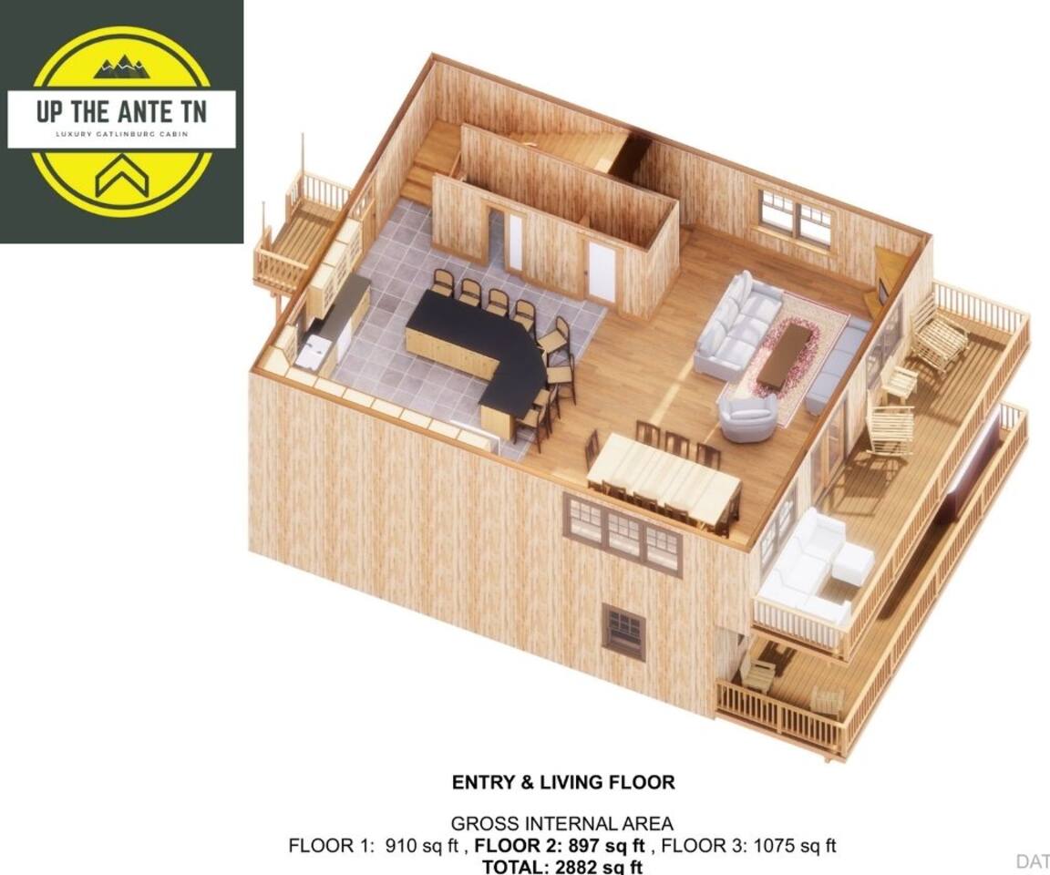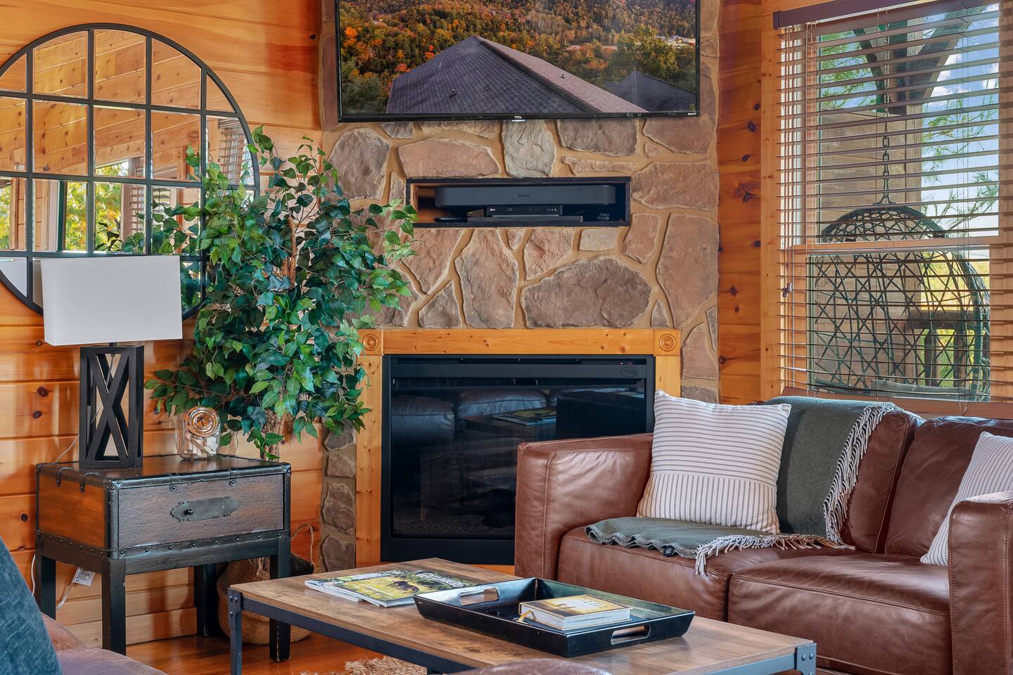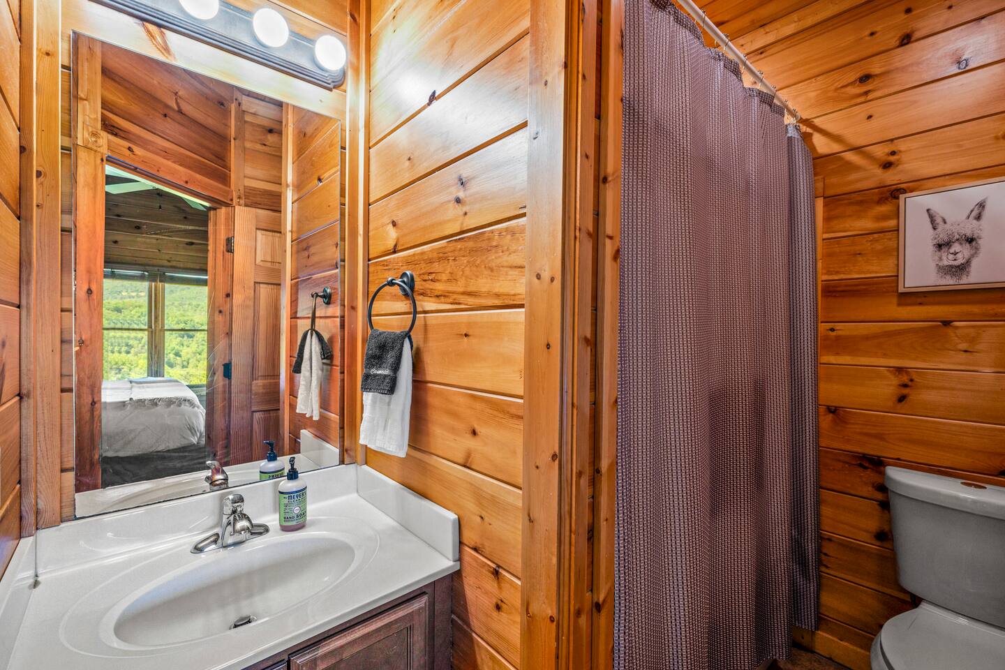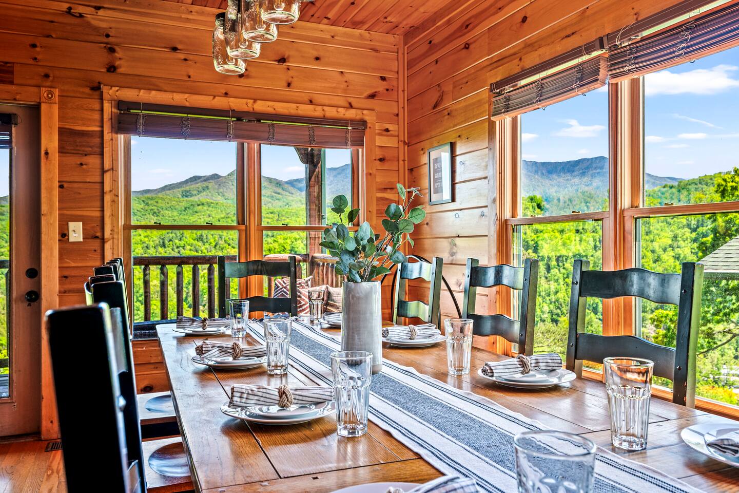 A modern farmhouse inspired cabin in the Gatlinburg Falls Parkview community designed for families traveling together that enjoy the creature comforts of home and a smart design aesthetic (upgraded winter '20). An easy drive just minutes from downtown Gatlinburg up gradual hills (not steep twisty drives like other cabins) along all paved roads that will immediately surprise you with glorious Smoky Mountain Views from all directions (including a Space Needle peek from our entry deck). Four master bedrooms all with private en-suite bathrooms and an entire gaming floor including a dedicated 9 person theater! LIVING SPACE: Our great room is on the main entry level and has a full size extended dining table with comfortable seating for at least 10. Additional seating is easily available at the island in the adjacent kitchen. The living room has a large sofa, a loveseat and and two side chairs arranged around the safe electric fireplace, 55" 4K Smart TV, blu-ray player and Sonos Beam Soundbar speaker. COOKING SPACE: The extra-large kitchen has a full size refrigerator and freezer, electric range/oven, microwave, dishwasher and sink with garbage disposal. There is ample storage made available during your stay so you can stock up easily and cook for your friends and family inside or out (large charcoal grill available directly next to our entry deck). GAMING SPACE: We're pleased to offer many fun games and activities during your stay. Grab a drink from the dedicated beverage cooler next to the leather pull-out couch and challenge a friend to any of the great games. We've outfitted the game floor with incredible creature comforts including head-to-head Pop-A-Shot basketball, full size regulation pool table, air hockey, chess/checkers table, full-size Multicade arcade game with 20+ arcade classics, 65" 4K Smart TV with cable and streaming choices. Directly next to the open gaming space you'll find a 9-person, stadium seating theater complete with a projected 125" screen and Dolby Digital THX Surround Sound. Watch a dizzying array of movies from our private Plex media server or stream from one of the many services available for access including Netflix, Hulu, Amazon Prime and more. Directly outside on the game floor deck you'll find our new 7 person hot tub with an incredible view of the Great Smoky Mountains and additional rocking chairs for relaxing. SLEEPING SPACE: We've outfitted all bedrooms to maximize you privacy, comfort and conveniences. Each room will have a wall-mounted 55" or 65" Roku 4K Smart TVs complete with cable and streaming access, a ceiling fan and individual bedside A/C + USB-C/A charging stations. A closet includes hanging shelves, clothing hangers and a luggage rack with laundry basket. Each individually designed bed features a cool-gel memory foam mattress, a stylish throw, decorative pillows and is fitted with luxurious, eco-friendly bamboo blend linens with two pillows per person (including soft and firm choices). Connected privately to each bedroom is a full en-suite bathroom with combination shower/tub with body sprayers and toiletries including complimentary hand-selected body wash, shampoo and conditioner. ★★★★★ Alpine Suite ★★★★★ The spacious grand master king bedroom (accommodates 2 people) is entered on the left and has North and East facing windows overlooking majestic views of the Great Smoky Mountains all the way to the Carolinas. Inside you'll find a comfy wingback chair, individual nightstands and reading lamps - perfect for a late night read and a glass of wine. ★★★★★ Summit Suite ★★★★★ The second bedroom to your left is also a large master king with windows facing East and South for incredible unobstructed views of the Great Smoky Mountains surrounding Gatlinburg and Anakeesta (accommodates 2 people). Individual nightstands flank each side of the bed as well as a plush barrel chair perfect to curl up with a book while the sun sets. ★★★★★ Vista Suite ★★★★★ The first bedroom to your right at the top of the stairs is a master king bedroom facing West with lush foliage on the bluff adjacent to the cabin. This bedroom includes individual nightstands on each side of the bed as well as a soft side chair to relax in. ★★★★★ Cub Den Bunk Suite ★★★★★ Entering the second room on your right, the kids (or additional adults) get first class treatment in the bunk room where dual full size bunk beds give them ample sleeping room (accommodates 4 people). South and West facing windows give you a view of the Gatlinburg Space Needle along with the Smoky Mountains surrounding downtown. A whimsical tent at the foot of the beds gives the kids a private hideaway for maximum relaxing. The entire home has Mesh WiFi with 250MB down high-speed internet for fast speeds for all of your devices. PARKING: On-site parking for up to four vehicles directly in front of the cabin is available. Level 2 Fast EV Charging station available for use during your stay. Up the Ante TN Cabin is extremely close to activities for adults or the entire family. Our digital welcome guide will provide you information about the home and the community. OTHER THINGS TO NOTE: By The Stats - General Starter Items provided at the house HYGIENE & CLEANING : • Cozy and complete Bamboo bed linens and pillows • Egyptian cotton bath towels and hand towels per person • 3 rolls of toilet paper per bathroom • 3 rolls of paper towels • Meyer's Hand soap, dish soap, dishwasher soap, laundry detergent, body wash, shampoo & conditioner • 1 dish sponge • 4 garbage bags • Hair dryer • Steamer COOKING & CULINARY CONVENIENCES : • Complete table service for 12 guests • Programmable coffee maker & combination Keurig + complimentary custom blend ground coffee (filters included) • Tea Kettle • Pots and pans • Toaster & Waffle Iron • Blender • Large serving bowls and a salad bowl • Additional items typically include salt, pepper