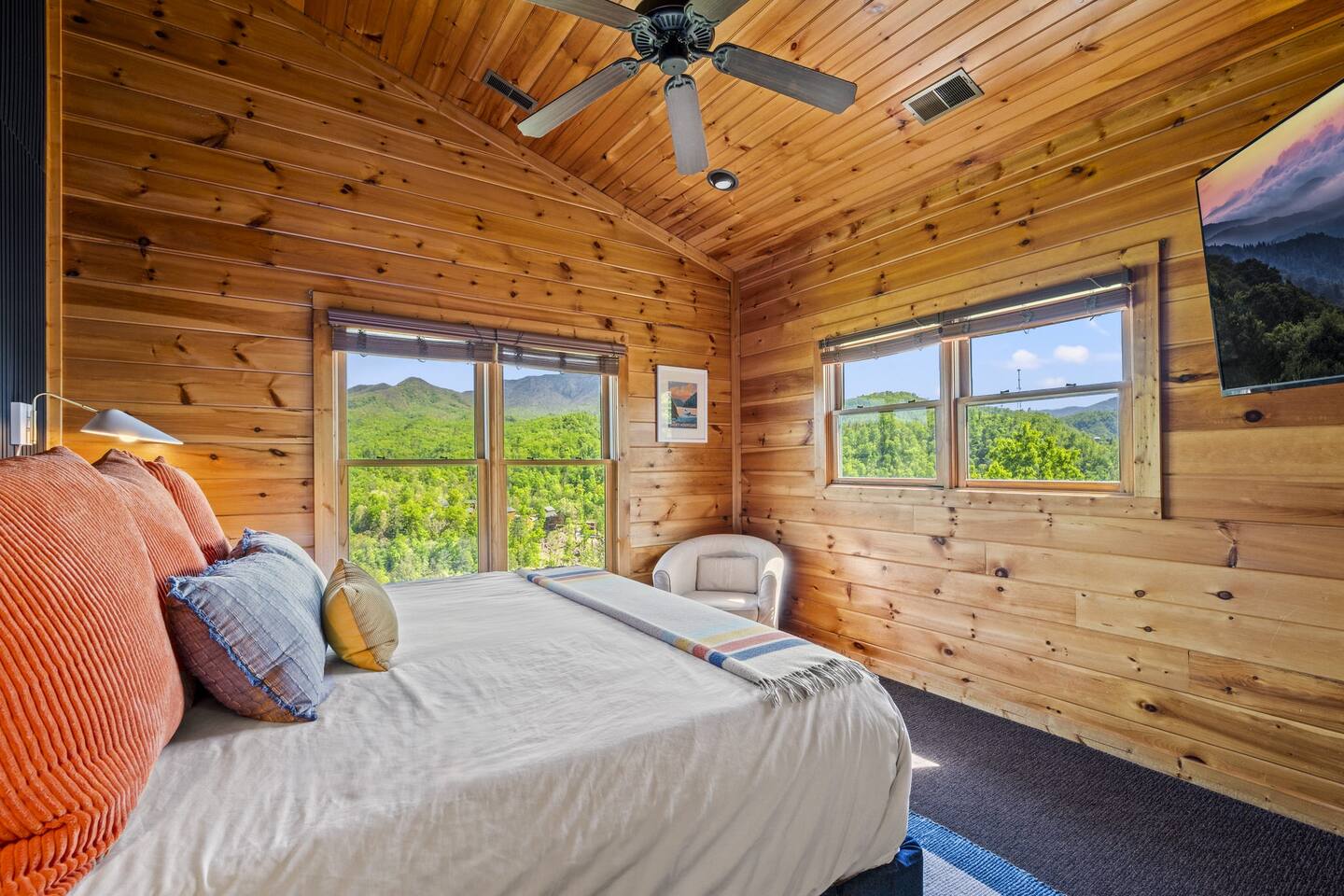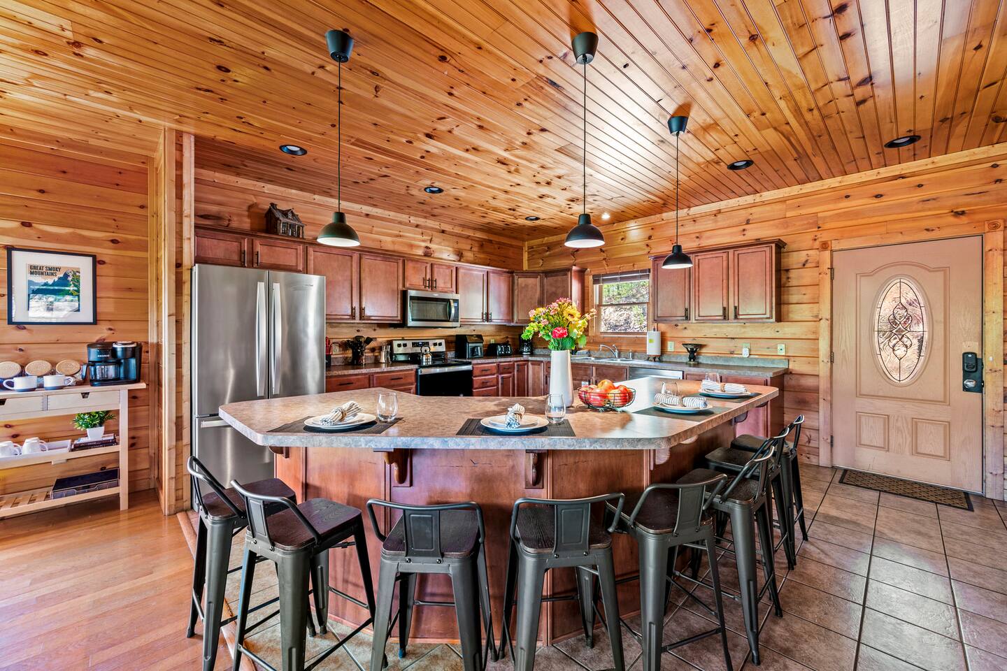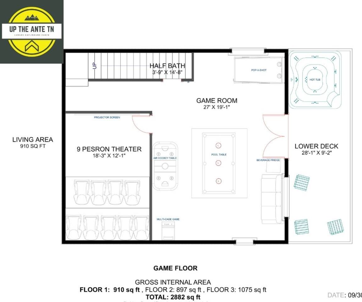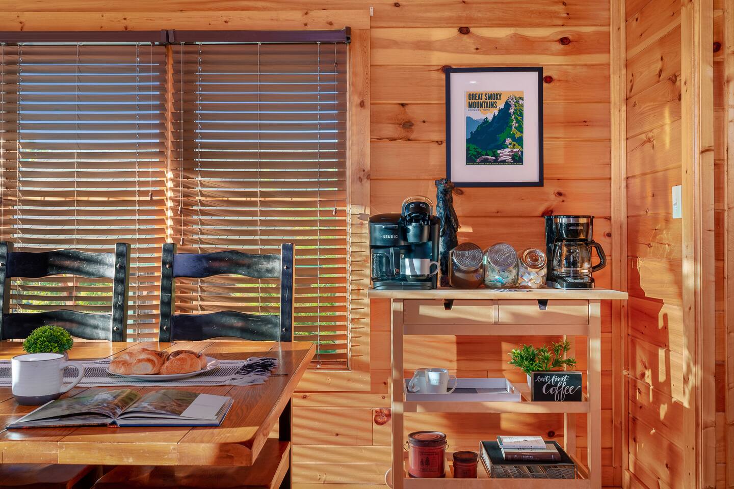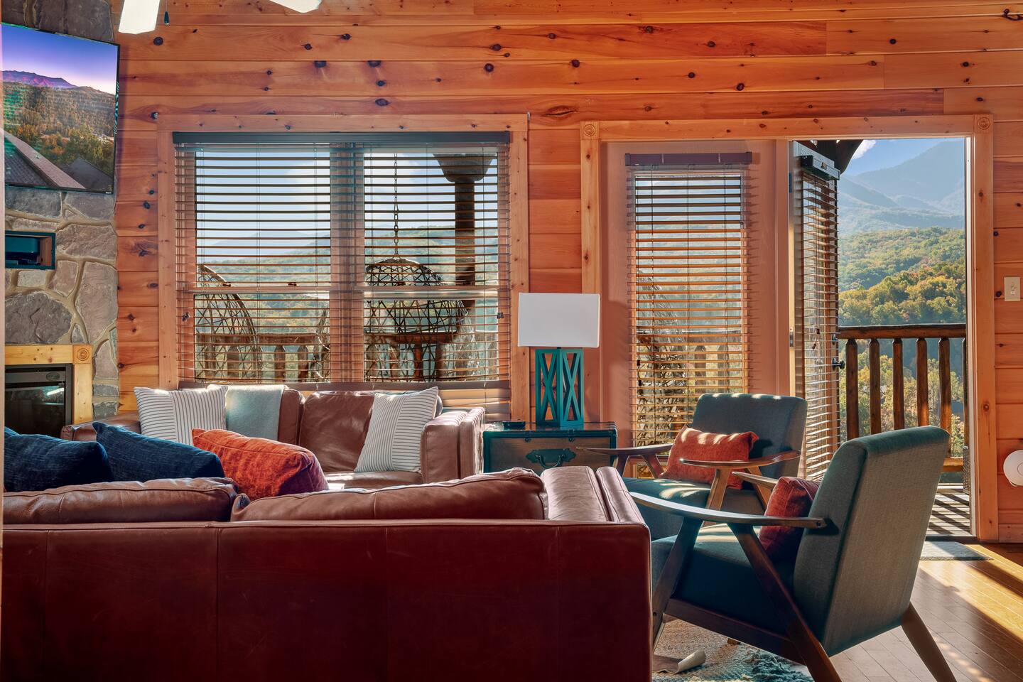 A modern farmhouse inspired cabin in the Gatlinburg Falls Parkview community designed for families traveling together that enjoy the creature comforts of home and a smart design aesthetic (upgraded winter '20). An easy drive just minutes from downtown Gatlinburg up gradual hills (not steep twisty drives like other cabins) along all paved roads that will immediately surprise you with glorious Smoky Mountain Views from all directions (including a Space Needle peek from our entry deck). Four master bedrooms all with private en-suite bathrooms and an entire gaming floor including a dedicated 9 person theater! LIVING SPACE: Our great room is on the main entry level and has a full size extended dining table with comfortable seating for at least 10. Additional seating is easily available at the island in the adjacent kitchen. The living room has a large sofa, a loveseat and and two side chairs arranged around the safe electric fireplace, 55" 4K Smart TV, blu-ray player and Sonos Beam Soundbar speaker. COOKING SPACE: The extra-large kitchen has a full size refrigerator and freezer, electric range/oven, microwave, dishwasher and sink with garbage disposal. There is ample storage made available during your stay so you can stock up easily and cook for your friends and family inside or out (large charcoal grill available directly next to our entry deck). GAMING SPACE: We're pleased to offer many fun games and activities during your stay. Grab a drink from the dedicated beverage cooler next to the leather pull-out couch and challenge a friend to any of the great games. We've outfitted the game floor with incredible creature comforts including head-to-head Pop-A-Shot basketball, full size regulation pool table, air hockey, chess/checkers table, full-size Multicade arcade game with 20+ arcade classics, 65" 4K Smart TV with cable and streaming choices. Directly next to the open gaming space you'll find a 9-person, stadium seating theater complete with a projected 125" screen and Dolby Digital THX Surround Sound. Watch a dizzying array of movies from our private Plex media server or stream from one of the many services available for access including Netflix, Hulu, Amazon Prime and more. Directly outside on the game floor deck you'll find our new 7 person hot tub with an incredible view of the Great Smoky Mountains and additional rocking chairs for relaxing. SLEEPING SPACE: We've outfitted all bedrooms to maximize you privacy, comfort and conveniences. Each room will have a wall-mounted 55" or 65" Roku 4K Smart TVs complete with cable and streaming access, a ceiling fan and individual bedside A/C + USB-C/A charging stations. A closet includes hanging shelves, clothing hangers and a luggage rack with laundry basket. Each individually designed bed features a cool-gel memory foam mattress, a stylish throw, decorative pillows and is fitted with luxurious, eco-friendly bamboo blend linens with two pillows per person (including soft and firm choices). Connected privately to each bedroom is a full en-suite bathroom with combination shower/tub with body sprayers and toiletries including complimentary hand-selected body wash, shampoo and conditioner. ★★★★★ Alpine Suite ★★★★★ The spacious grand master king bedroom (accommodates 2 people) is entered on the left and has North and East facing windows overlooking majestic views of the Great Smoky Mountains all the way to the Carolinas. Inside you'll find a comfy wingback chair, individual nightstands and reading lamps - perfect for a late night read and a glass of wine. ★★★★★ Summit Suite ★★★★★ The second bedroom to your left is also a large master king with windows facing East and South for incredible unobstructed views of the Great Smoky Mountains surrounding Gatlinburg and Anakeesta (accommodates 2 people). Individual nightstands flank each side of the bed as well as a plush barrel chair perfect to curl up with a book while the sun sets. ★★★★★ Vista Suite ★★★★★ The first bedroom to your right at the top of the stairs is a master king bedroom facing West with lush foliage on the bluff adjacent to the cabin. This bedroom includes individual nightstands on each side of the bed as well as a soft side chair to relax in. ★★★★★ Cub Den Bunk Suite ★★★★★ Entering the second room on your right, the kids (or additional adults) get first class treatment in the bunk room where dual full size bunk beds give them ample sleeping room (accommodates 4 people). South and West facing windows give you a view of the Gatlinburg Space Needle along with the Smoky Mountains surrounding downtown. A whimsical tent at the foot of the beds gives the kids a private hideaway for maximum relaxing. The entire home has Mesh WiFi with 250MB down high-speed internet for fast speeds for all of your devices. PARKING: On-site parking for up to four vehicles directly in front of the cabin is available. Level 2 Fast EV Charging station available for use during your stay. Up the Ante TN Cabin is extremely close to activities for adults or the entire family. Our digital welcome guide will provide you information about the home and the community. OTHER THINGS TO NOTE: By The Stats - General Starter Items provided at the house HYGIENE & CLEANING : • Cozy and complete Bamboo bed linens and pillows • Egyptian cotton bath towels and hand towels per person • 3 rolls of toilet paper per bathroom • 3 rolls of paper towels • Meyer's Hand soap, dish soap, dishwasher soap, laundry detergent, body wash, shampoo & conditioner • 1 dish sponge • 4 garbage bags • Hair dryer • Steamer COOKING & CULINARY CONVENIENCES : • Complete table service for 12 guests • Programmable coffee maker & combination Keurig + complimentary custom blend ground coffee (filters included) • Tea Kettle • Pots and pans • Toaster & Waffle Iron • Blender • Large serving bowls and a salad bowl • Additional items typically include salt, pepper