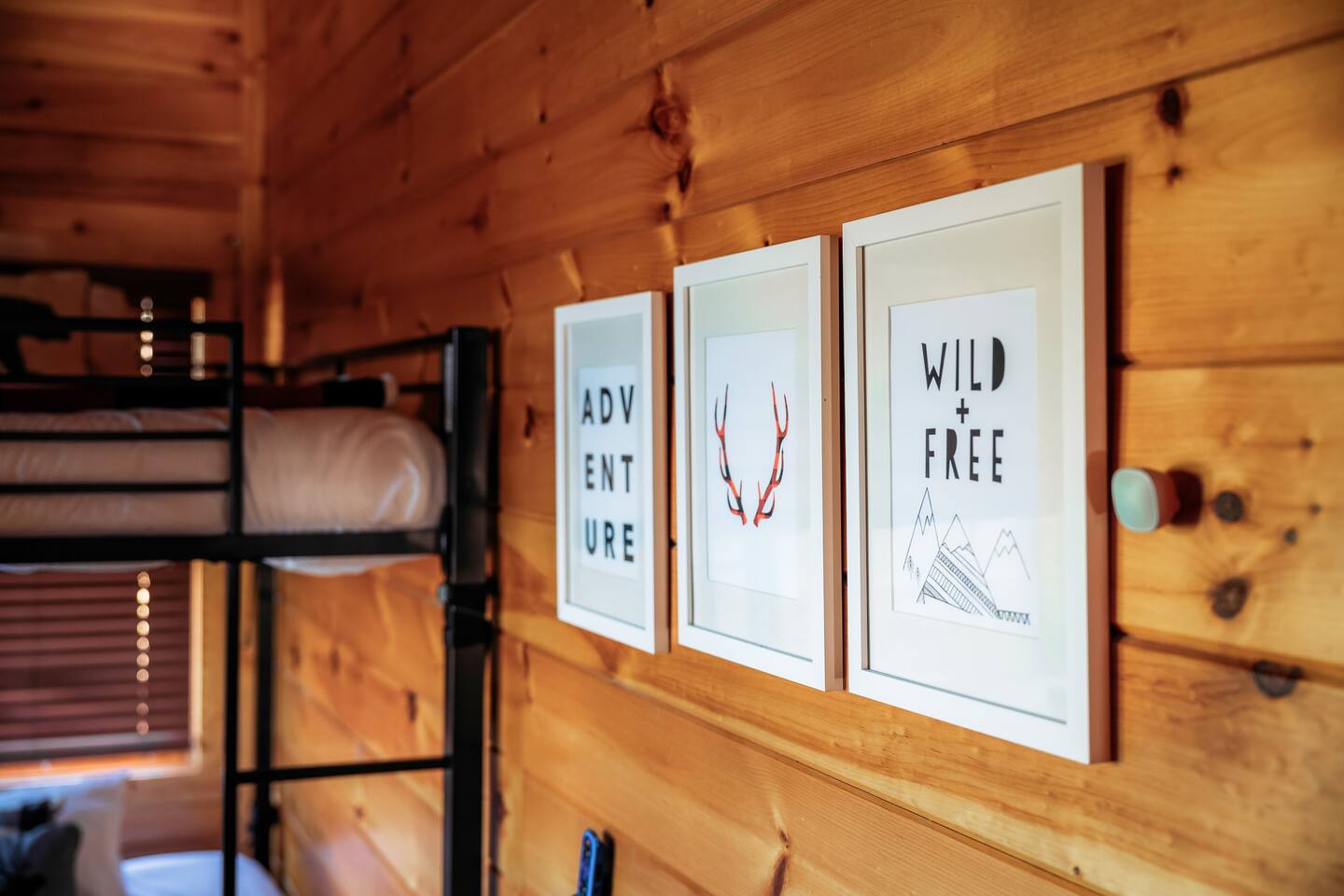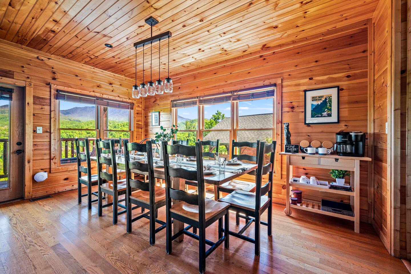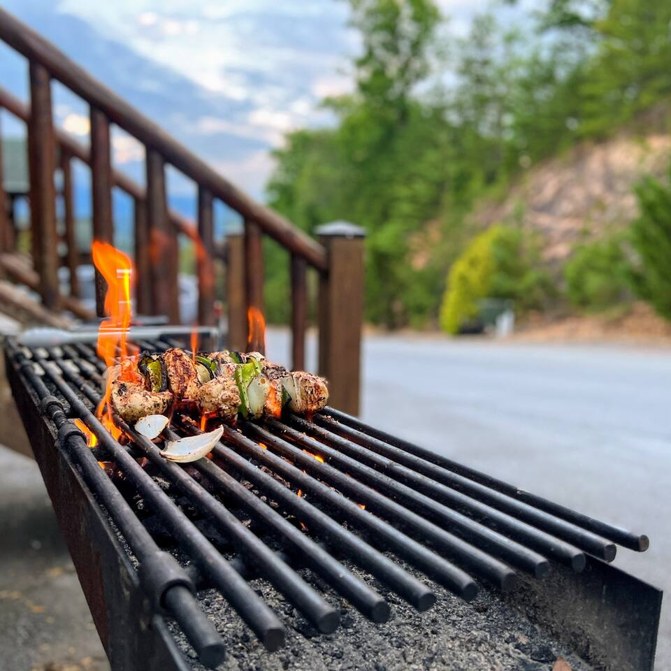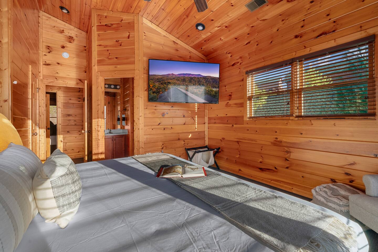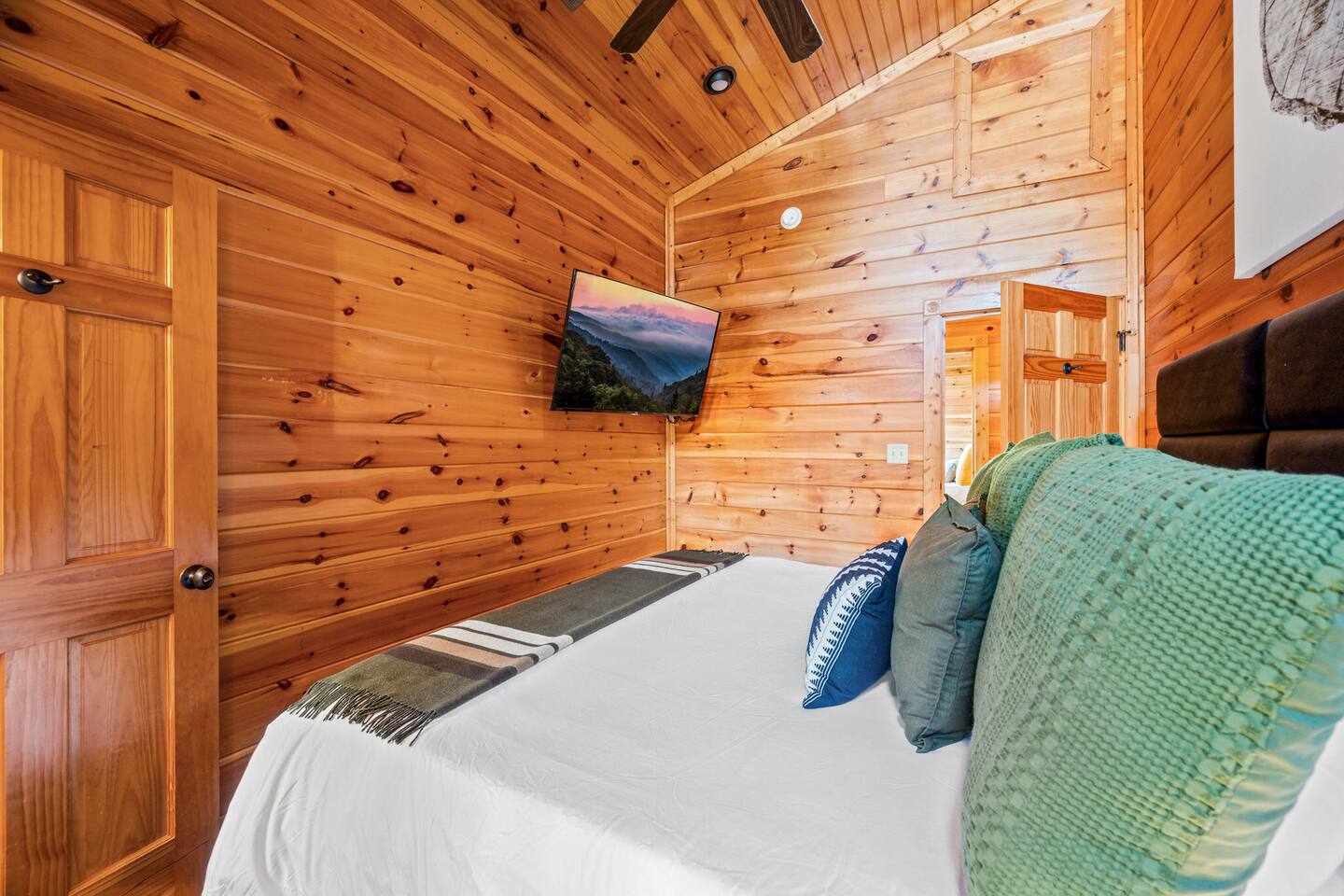 A modern farmhouse inspired cabin in the Gatlinburg Falls Parkview community designed for families traveling together that enjoy the creature comforts of home and a smart design aesthetic (upgraded winter '20). An easy drive just minutes from downtown Gatlinburg up gradual hills (not steep twisty drives like other cabins) along all paved roads that will immediately surprise you with glorious Smoky Mountain Views from all directions (including a Space Needle peek from our entry deck). Four master bedrooms all with private en-suite bathrooms and an entire gaming floor including a dedicated 9 person theater! LIVING SPACE: Our great room is on the main entry level and has a full size extended dining table with comfortable seating for at least 10. Additional seating is easily available at the island in the adjacent kitchen. The living room has a large sofa, a loveseat and and two side chairs arranged around the safe electric fireplace, 55" 4K Smart TV, blu-ray player and Sonos Beam Soundbar speaker. COOKING SPACE: The extra-large kitchen has a full size refrigerator and freezer, electric range/oven, microwave, dishwasher and sink with garbage disposal. There is ample storage made available during your stay so you can stock up easily and cook for your friends and family inside or out (large charcoal grill available directly next to our entry deck). GAMING SPACE: We're pleased to offer many fun games and activities during your stay. Grab a drink from the dedicated beverage cooler next to the leather pull-out couch and challenge a friend to any of the great games. We've outfitted the game floor with incredible creature comforts including head-to-head Pop-A-Shot basketball, full size regulation pool table, air hockey, chess/checkers table, full-size Multicade arcade game with 20+ arcade classics, 65" 4K Smart TV with cable and streaming choices. Directly next to the open gaming space you'll find a 9-person, stadium seating theater complete with a projected 125" screen and Dolby Digital THX Surround Sound. Watch a dizzying array of movies from our private Plex media server or stream from one of the many services available for access including Netflix, Hulu, Amazon Prime and more. Directly outside on the game floor deck you'll find our new 7 person hot tub with an incredible view of the Great Smoky Mountains and additional rocking chairs for relaxing. SLEEPING SPACE: We've outfitted all bedrooms to maximize you privacy, comfort and conveniences. Each room will have a wall-mounted 55" or 65" Roku 4K Smart TVs complete with cable and streaming access, a ceiling fan and individual bedside A/C + USB-C/A charging stations. A closet includes hanging shelves, clothing hangers and a luggage rack with laundry basket. Each individually designed bed features a cool-gel memory foam mattress, a stylish throw, decorative pillows and is fitted with luxurious, eco-friendly bamboo blend linens with two pillows per person (including soft and firm choices). Connected privately to each bedroom is a full en-suite bathroom with combination shower/tub with body sprayers and toiletries including complimentary hand-selected body wash, shampoo and conditioner. ★★★★★ Alpine Suite ★★★★★ The spacious grand master king bedroom (accommodates 2 people) is entered on the left and has North and East facing windows overlooking majestic views of the Great Smoky Mountains all the way to the Carolinas. Inside you'll find a comfy wingback chair, individual nightstands and reading lamps - perfect for a late night read and a glass of wine. ★★★★★ Summit Suite ★★★★★ The second bedroom to your left is also a large master king with windows facing East and South for incredible unobstructed views of the Great Smoky Mountains surrounding Gatlinburg and Anakeesta (accommodates 2 people). Individual nightstands flank each side of the bed as well as a plush barrel chair perfect to curl up with a book while the sun sets. ★★★★★ Vista Suite ★★★★★ The first bedroom to your right at the top of the stairs is a master king bedroom facing West with lush foliage on the bluff adjacent to the cabin. This bedroom includes individual nightstands on each side of the bed as well as a soft side chair to relax in. ★★★★★ Cub Den Bunk Suite ★★★★★ Entering the second room on your right, the kids (or additional adults) get first class treatment in the bunk room where dual full size bunk beds give them ample sleeping room (accommodates 4 people). South and West facing windows give you a view of the Gatlinburg Space Needle along with the Smoky Mountains surrounding downtown. A whimsical tent at the foot of the beds gives the kids a private hideaway for maximum relaxing. The entire home has Mesh WiFi with 250MB down high-speed internet for fast speeds for all of your devices. PARKING: On-site parking for up to four vehicles directly in front of the cabin is available. Level 2 Fast EV Charging station available for use during your stay. Up the Ante TN Cabin is extremely close to activities for adults or the entire family. Our digital welcome guide will provide you information about the home and the community. OTHER THINGS TO NOTE: By The Stats - General Starter Items provided at the house HYGIENE & CLEANING : • Cozy and complete Bamboo bed linens and pillows • Egyptian cotton bath towels and hand towels per person • 3 rolls of toilet paper per bathroom • 3 rolls of paper towels • Meyer's Hand soap, dish soap, dishwasher soap, laundry detergent, body wash, shampoo & conditioner • 1 dish sponge • 4 garbage bags • Hair dryer • Steamer COOKING & CULINARY CONVENIENCES : • Complete table service for 12 guests • Programmable coffee maker & combination Keurig + complimentary custom blend ground coffee (filters included) • Tea Kettle • Pots and pans • Toaster & Waffle Iron • Blender • Large serving bowls and a salad bowl • Additional items typically include salt, pepper