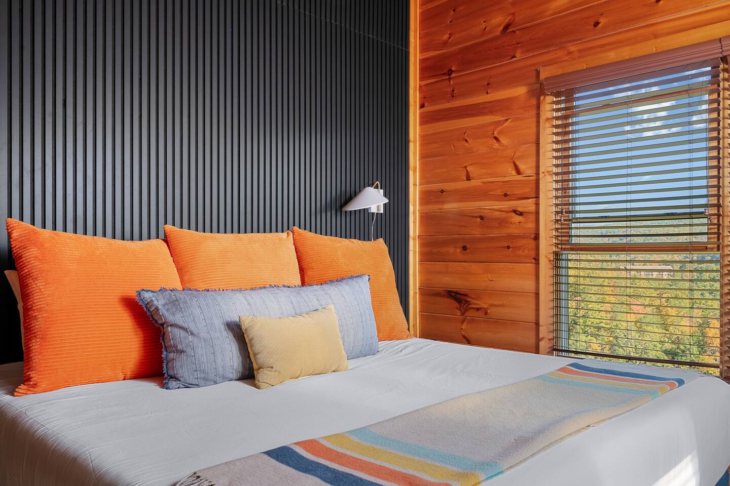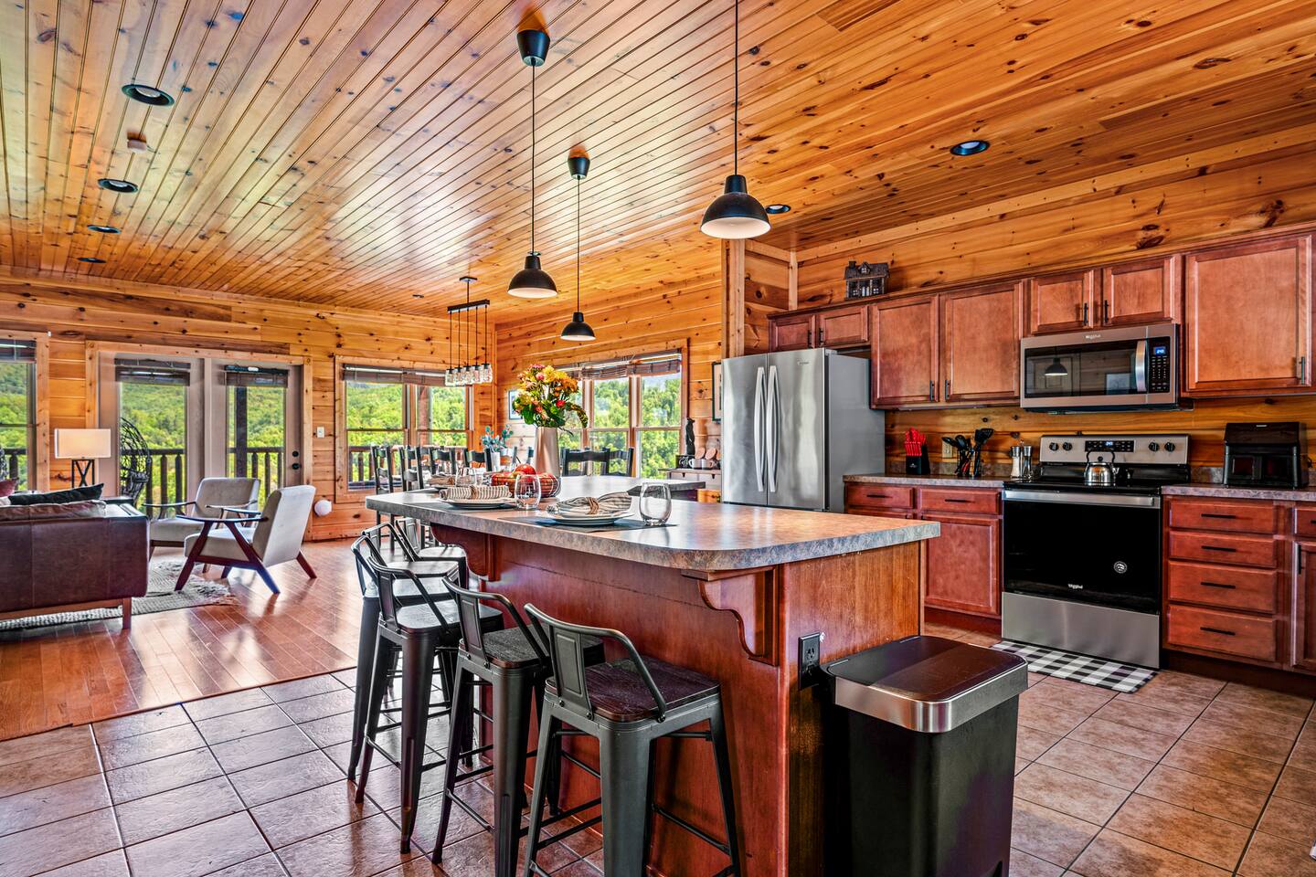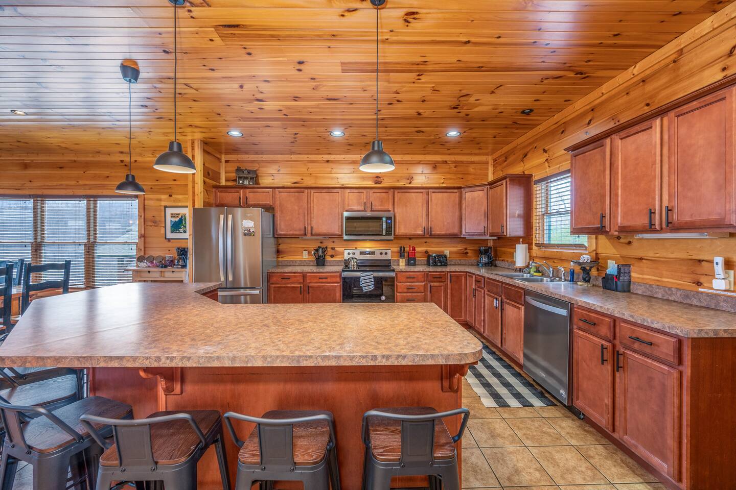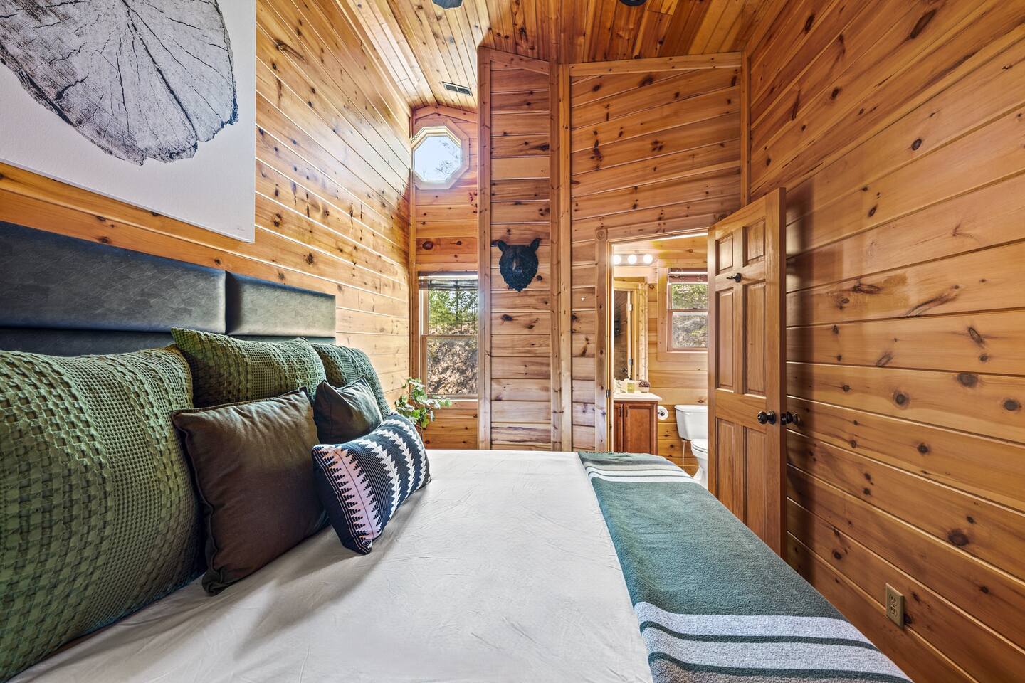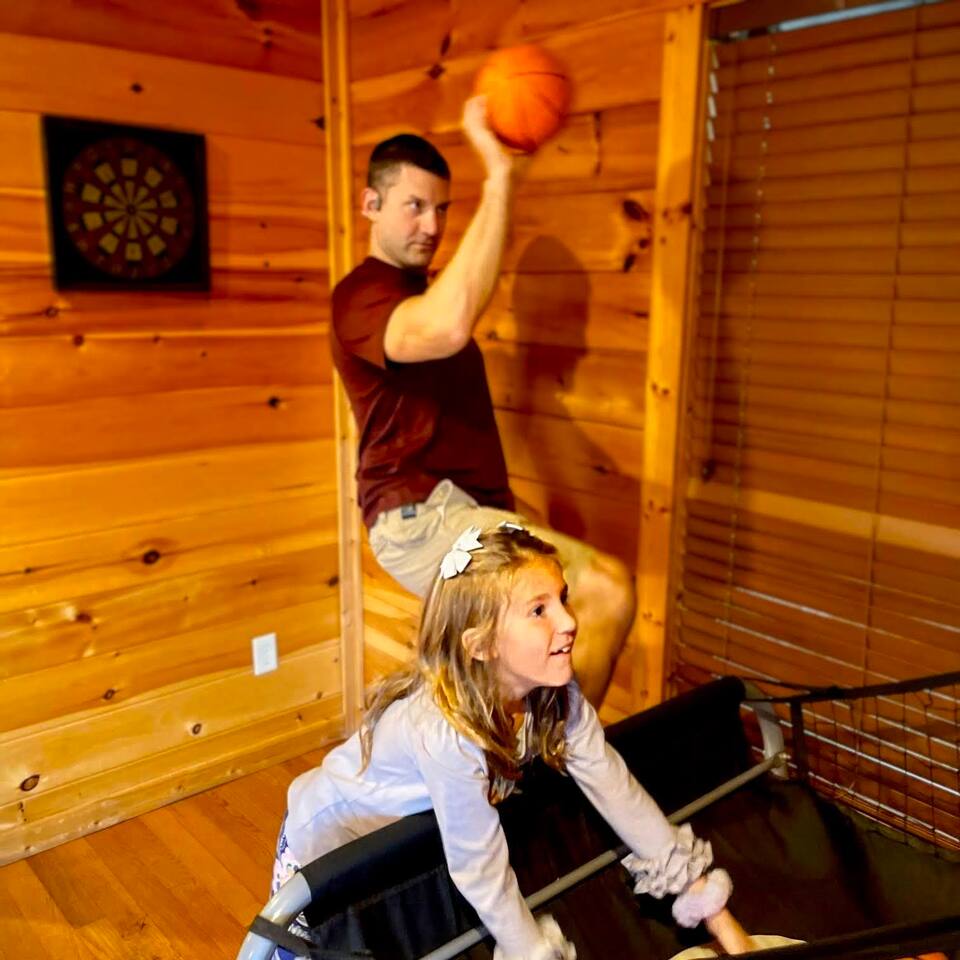 A modern farmhouse inspired cabin in the Gatlinburg Falls Parkview community designed for families traveling together that enjoy the creature comforts of home and a smart design aesthetic (upgraded winter '20). An easy drive just minutes from downtown Gatlinburg up gradual hills (not steep twisty drives like other cabins) along all paved roads that will immediately surprise you with glorious Smoky Mountain Views from all directions (including a Space Needle peek from our entry deck). Four master bedrooms all with private en-suite bathrooms and an entire gaming floor including a dedicated 9 person theater! LIVING SPACE: Our great room is on the main entry level and has a full size extended dining table with comfortable seating for at least 10. Additional seating is easily available at the island in the adjacent kitchen. The living room has a large sofa, a loveseat and and two side chairs arranged around the safe electric fireplace, 55" 4K Smart TV, blu-ray player and Sonos Beam Soundbar speaker. COOKING SPACE: The extra-large kitchen has a full size refrigerator and freezer, electric range/oven, microwave, dishwasher and sink with garbage disposal. There is ample storage made available during your stay so you can stock up easily and cook for your friends and family inside or out (large charcoal grill available directly next to our entry deck). GAMING SPACE: We're pleased to offer many fun games and activities during your stay. Grab a drink from the dedicated beverage cooler next to the leather pull-out couch and challenge a friend to any of the great games. We've outfitted the game floor with incredible creature comforts including head-to-head Pop-A-Shot basketball, full size regulation pool table, air hockey, chess/checkers table, full-size Multicade arcade game with 20+ arcade classics, 65" 4K Smart TV with cable and streaming choices. Directly next to the open gaming space you'll find a 9-person, stadium seating theater complete with a projected 125" screen and Dolby Digital THX Surround Sound. Watch a dizzying array of movies from our private Plex media server or stream from one of the many services available for access including Netflix, Hulu, Amazon Prime and more. Directly outside on the game floor deck you'll find our new 7 person hot tub with an incredible view of the Great Smoky Mountains and additional rocking chairs for relaxing. SLEEPING SPACE: We've outfitted all bedrooms to maximize you privacy, comfort and conveniences. Each room will have a wall-mounted 55" or 65" Roku 4K Smart TVs complete with cable and streaming access, a ceiling fan and individual bedside A/C + USB-C/A charging stations. A closet includes hanging shelves, clothing hangers and a luggage rack with laundry basket. Each individually designed bed features a cool-gel memory foam mattress, a stylish throw, decorative pillows and is fitted with luxurious, eco-friendly bamboo blend linens with two pillows per person (including soft and firm choices). Connected privately to each bedroom is a full en-suite bathroom with combination shower/tub with body sprayers and toiletries including complimentary hand-selected body wash, shampoo and conditioner. ★★★★★ Alpine Suite ★★★★★ The spacious grand master king bedroom (accommodates 2 people) is entered on the left and has North and East facing windows overlooking majestic views of the Great Smoky Mountains all the way to the Carolinas. Inside you'll find a comfy wingback chair, individual nightstands and reading lamps - perfect for a late night read and a glass of wine. ★★★★★ Summit Suite ★★★★★ The second bedroom to your left is also a large master king with windows facing East and South for incredible unobstructed views of the Great Smoky Mountains surrounding Gatlinburg and Anakeesta (accommodates 2 people). Individual nightstands flank each side of the bed as well as a plush barrel chair perfect to curl up with a book while the sun sets. ★★★★★ Vista Suite ★★★★★ The first bedroom to your right at the top of the stairs is a master king bedroom facing West with lush foliage on the bluff adjacent to the cabin. This bedroom includes individual nightstands on each side of the bed as well as a soft side chair to relax in. ★★★★★ Cub Den Bunk Suite ★★★★★ Entering the second room on your right, the kids (or additional adults) get first class treatment in the bunk room where dual full size bunk beds give them ample sleeping room (accommodates 4 people). South and West facing windows give you a view of the Gatlinburg Space Needle along with the Smoky Mountains surrounding downtown. A whimsical tent at the foot of the beds gives the kids a private hideaway for maximum relaxing. The entire home has Mesh WiFi with 250MB down high-speed internet for fast speeds for all of your devices. PARKING: On-site parking for up to four vehicles directly in front of the cabin is available. Level 2 Fast EV Charging station available for use during your stay. Up the Ante TN Cabin is extremely close to activities for adults or the entire family. Our digital welcome guide will provide you information about the home and the community. OTHER THINGS TO NOTE: By The Stats - General Starter Items provided at the house HYGIENE & CLEANING : • Cozy and complete Bamboo bed linens and pillows • Egyptian cotton bath towels and hand towels per person • 3 rolls of toilet paper per bathroom • 3 rolls of paper towels • Meyer's Hand soap, dish soap, dishwasher soap, laundry detergent, body wash, shampoo & conditioner • 1 dish sponge • 4 garbage bags • Hair dryer • Steamer COOKING & CULINARY CONVENIENCES : • Complete table service for 12 guests • Programmable coffee maker & combination Keurig + complimentary custom blend ground coffee (filters included) • Tea Kettle • Pots and pans • Toaster & Waffle Iron • Blender • Large serving bowls and a salad bowl • Additional items typically include salt, pepper