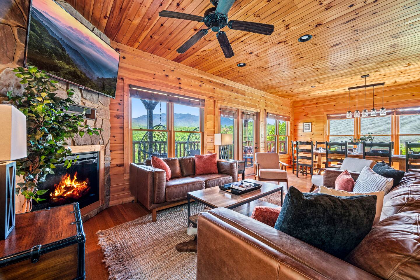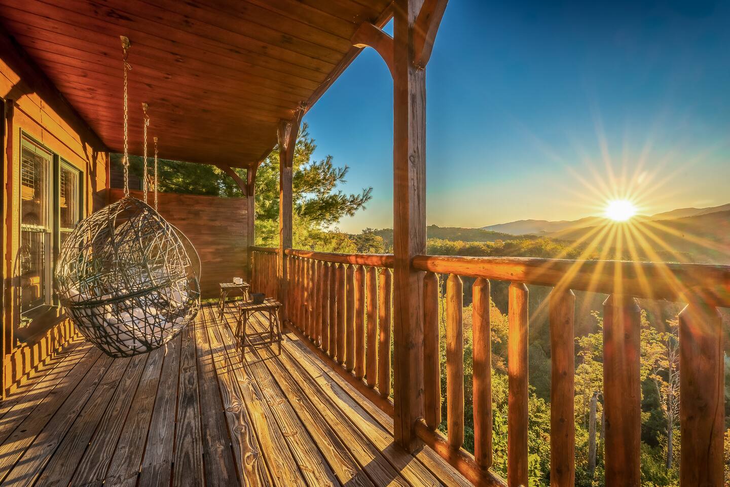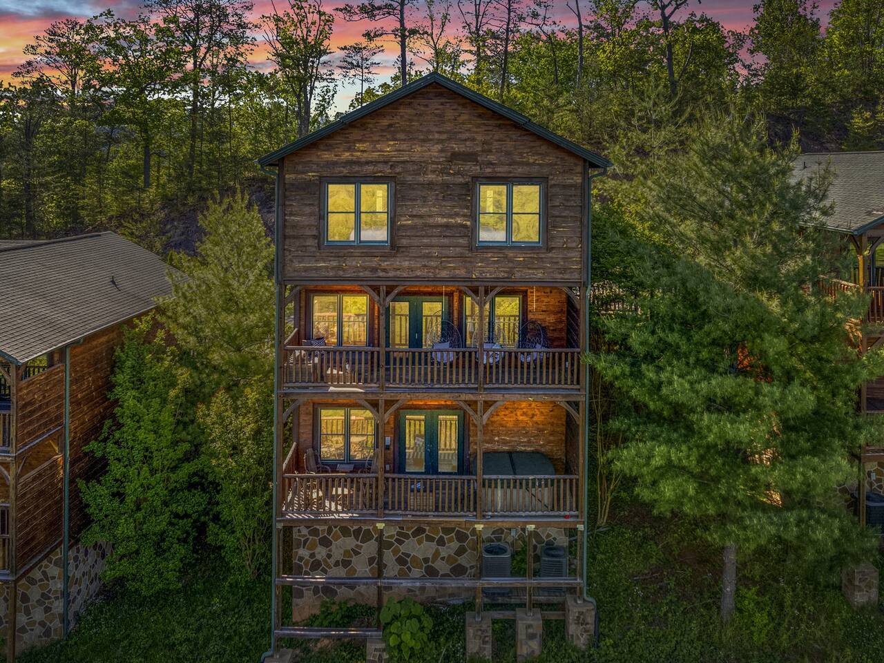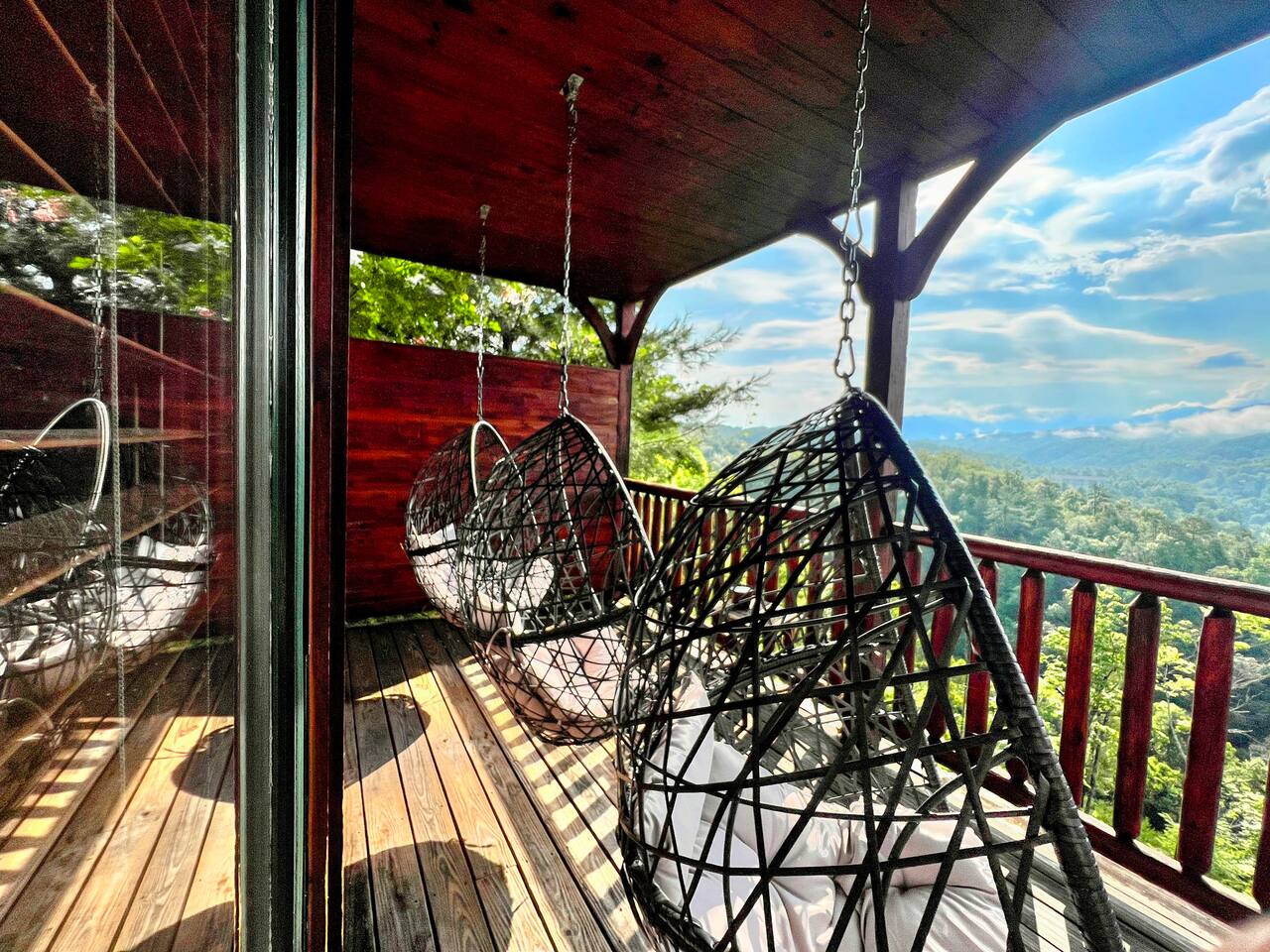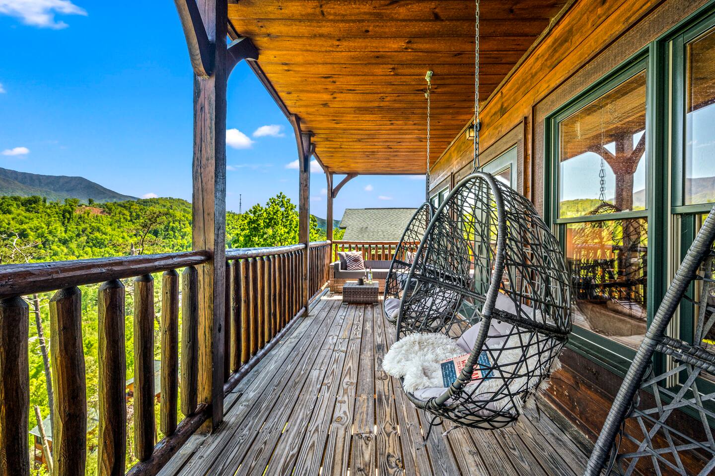 Discover tranquility in our rustic-modern 2500 sf 3-level Cabin in Gatlinburg, UP THE ANTE TN. Only minutes from downtown, this spacious retreat boasts 4 bedrooms w/private en-suite bath, 3 w/king beds. Guests rave about -BREATHTAKING VIEWS & WELCOMING ATMOSPHERE- - Sleeps 12: 2-3 families - Amenities: Game floor+theater, large hot tub - Views: Stunning long-range Smoky Mountain views - Relax: Hanging egg chairs - Views from all floors & most rooms - Level 2 Fast EV Charging - No steep roads