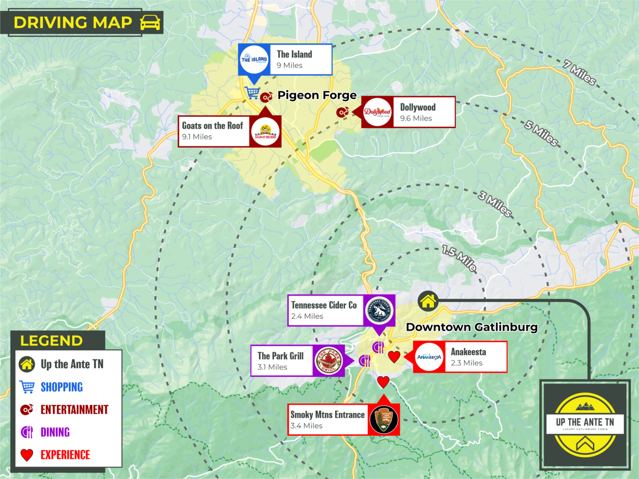 Unlike many cabins that have views, you'll have an easy drive (winter or summer) getting to Up the Ante TN. Gradual rising roads (all fully paved and serviced by the city of Gatlinburg) take you from the Parkway to our home in less than 5 minutes. Visiting downtown Gatlinburg couldn't be easier with a 6 minute drive to arrive at the strip (with two ways to access). Pigeon Forge (including the famous Dollywood park) is less than 18 minutes away.